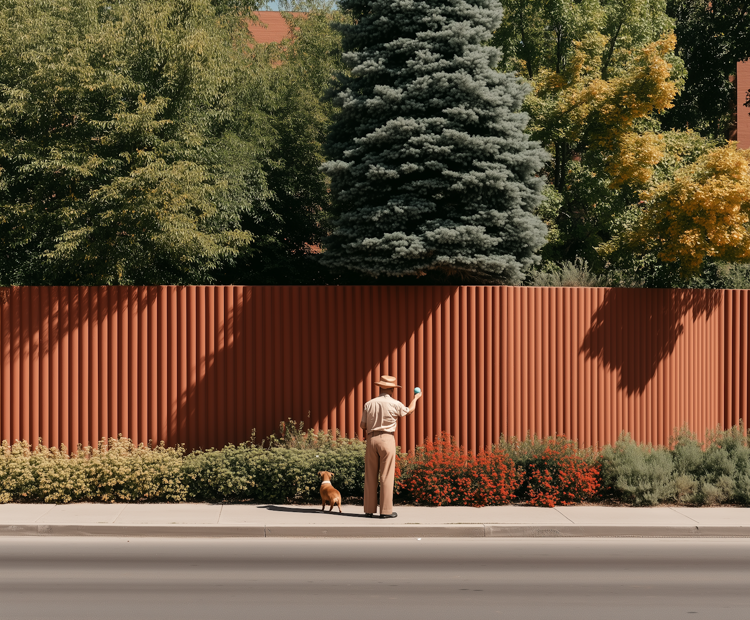 Man with a straw hat and dog stands by a rust-colored fence, surrounded by lush greenery and vibrant flowers.