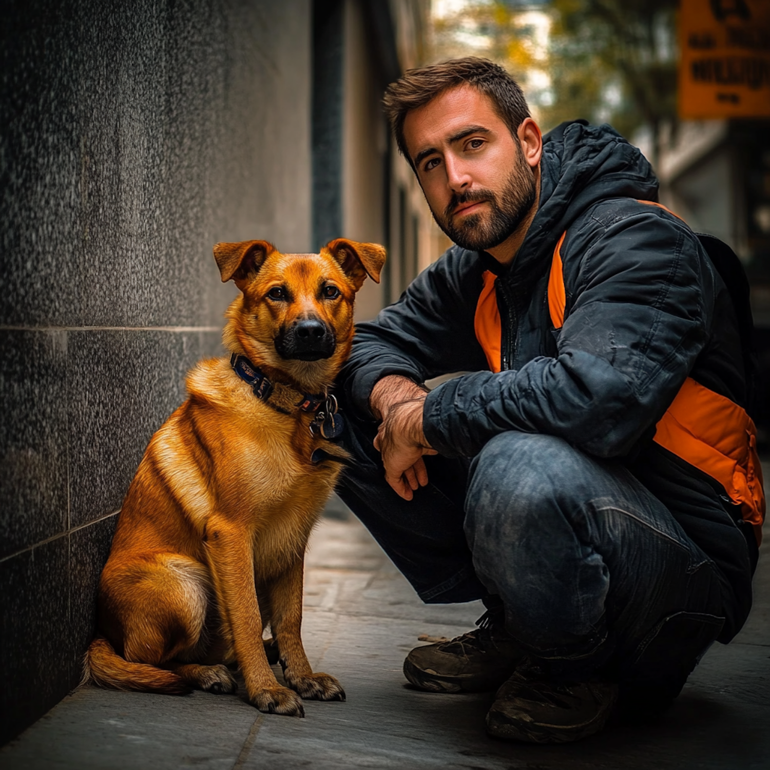 Man crouching beside a brown dog on a city sidewalk, both looking at the camera. Urban background with soft lighting.