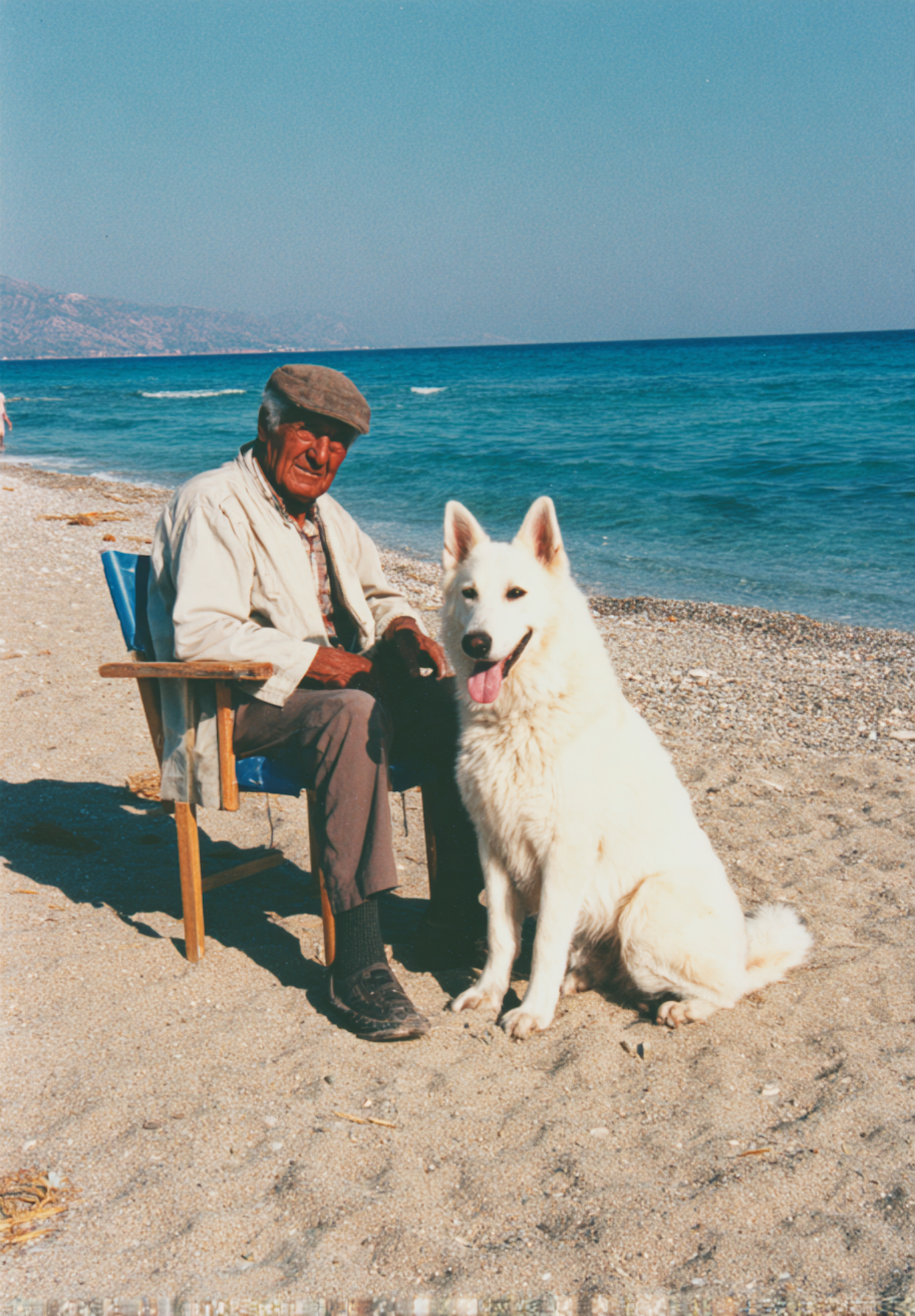 Elderly man and his white German Shepherd enjoying a sunny day on a serene beach with clear blue waters and distant mountains.