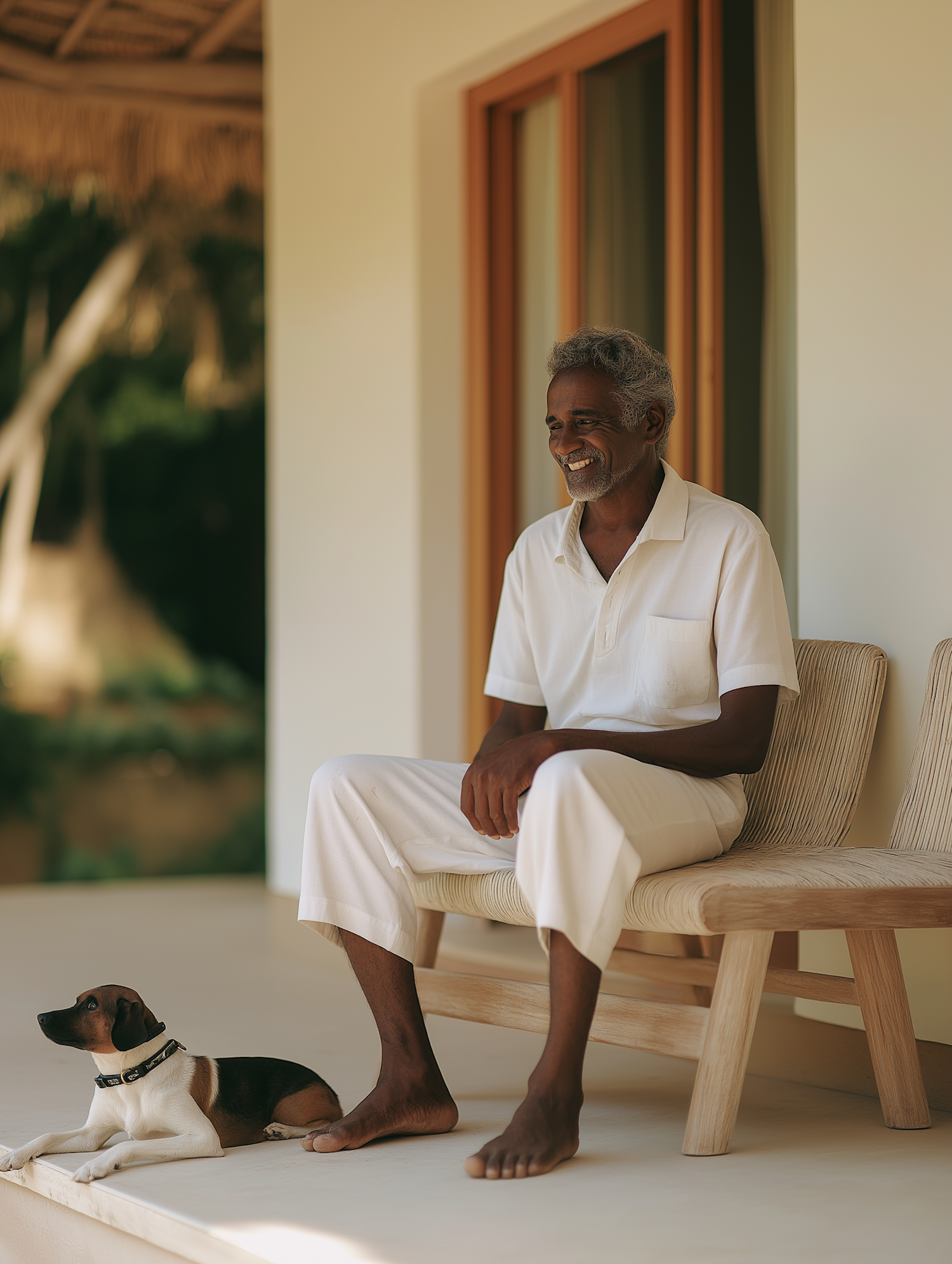 Elderly man in white attire sits joyfully on a porch with his attentive dog, creating a serene and warm atmosphere.
