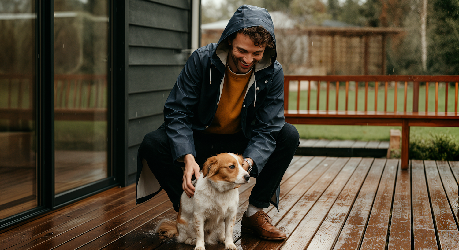 A man in a raincoat pets his dog on a rainy day, sitting on a wooden deck with a garden in the background.