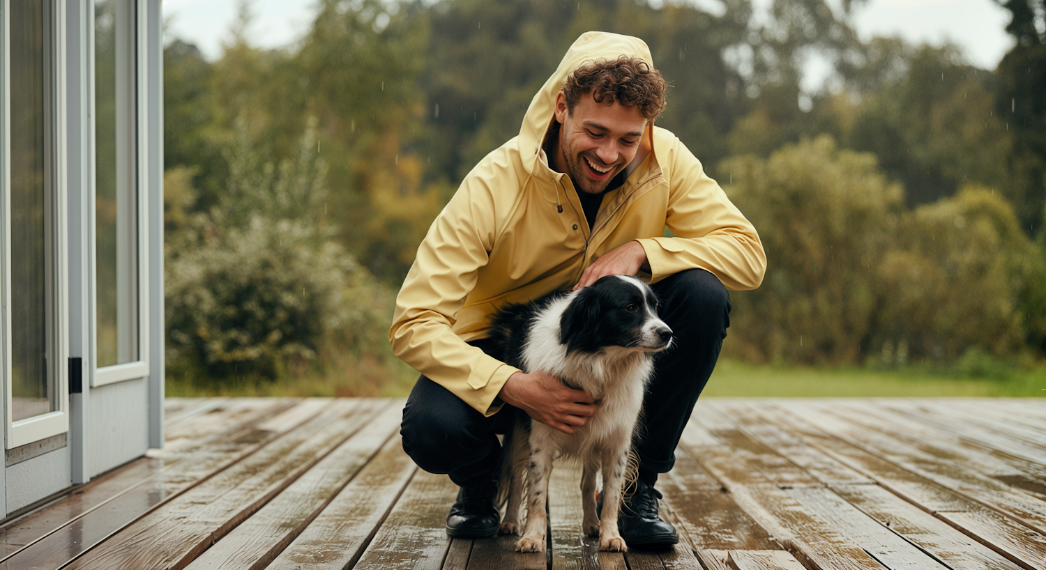 A man in a yellow raincoat crouches on a wet deck, smiling as he pets a black and white dog, with a lush green background.