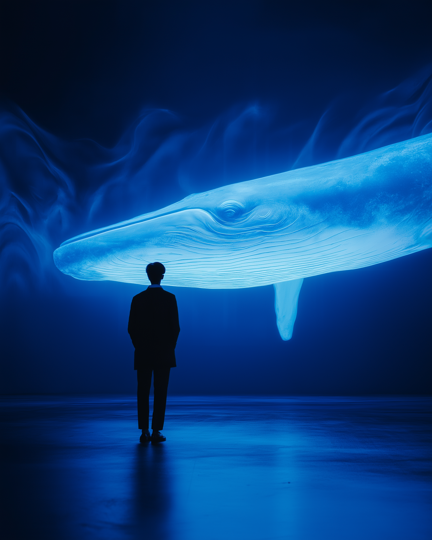 A man in a dark suit gazes at a glowing blue whale in a surreal, illuminated space. Dreamlike and serene, with swirling light effects.
