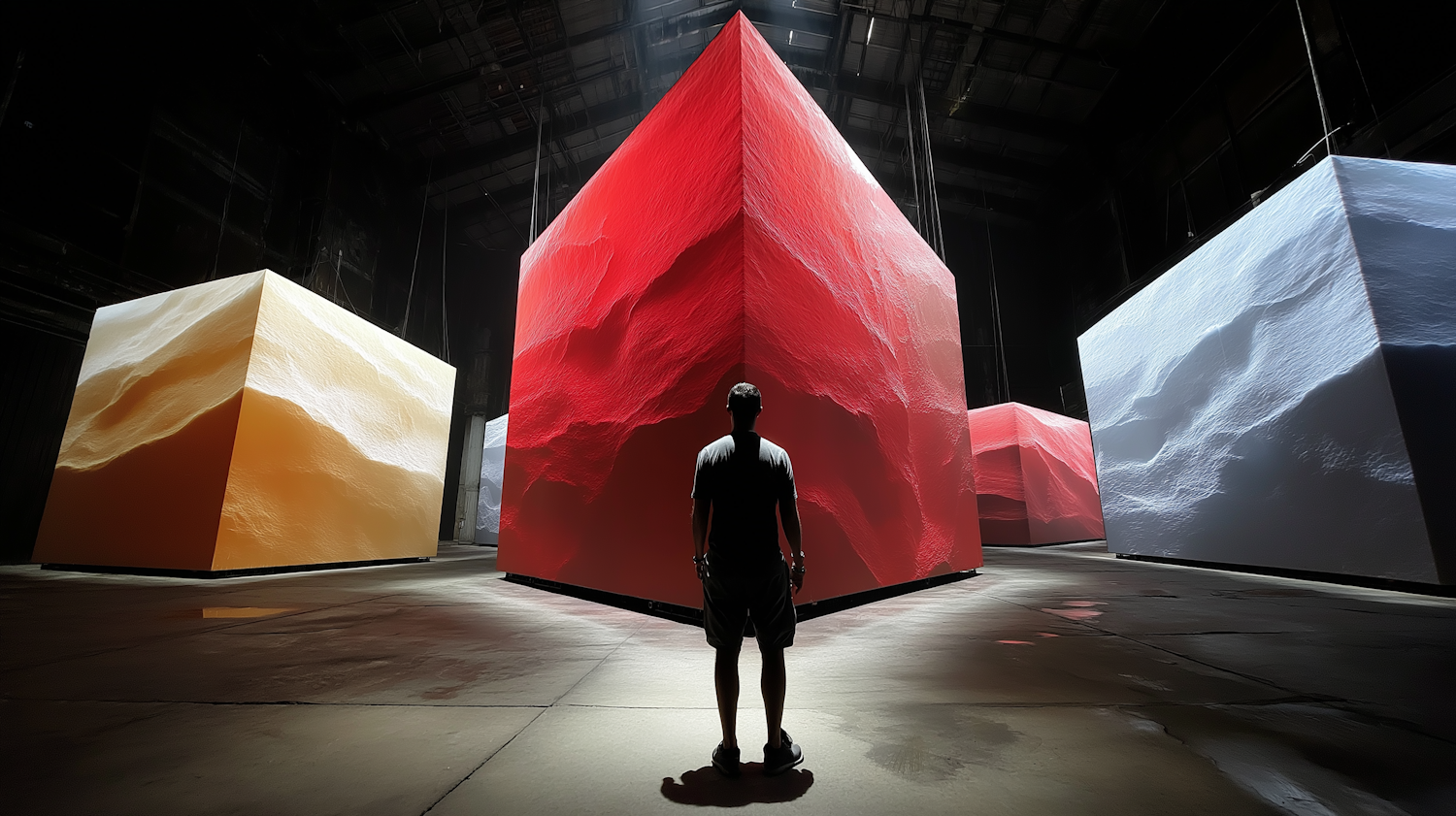 A man observes large, glowing textured cubes in red, orange, and white in a dark, industrial-style space. Immersive art installation.