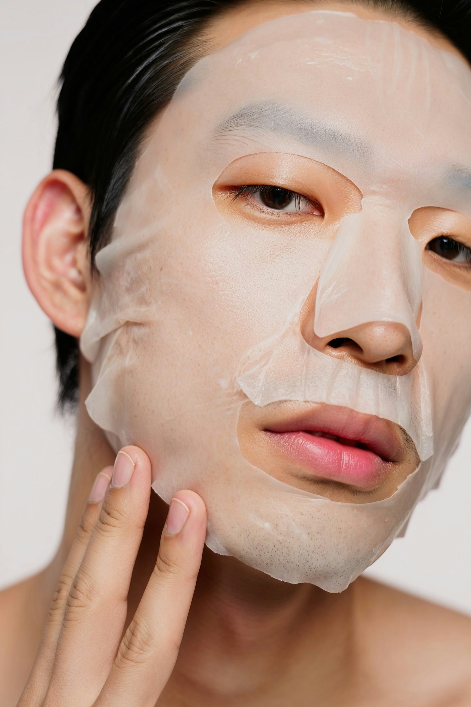Close-up of a man applying a sheet mask, focusing on skincare. The semi-transparent mask highlights his facial features and smooth complexion.