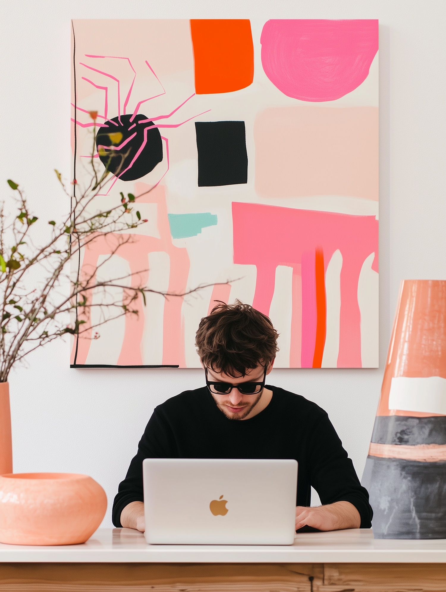 Man in sunglasses working on a laptop with abstract art and ceramic vases in the background, creating a modern artistic vibe.