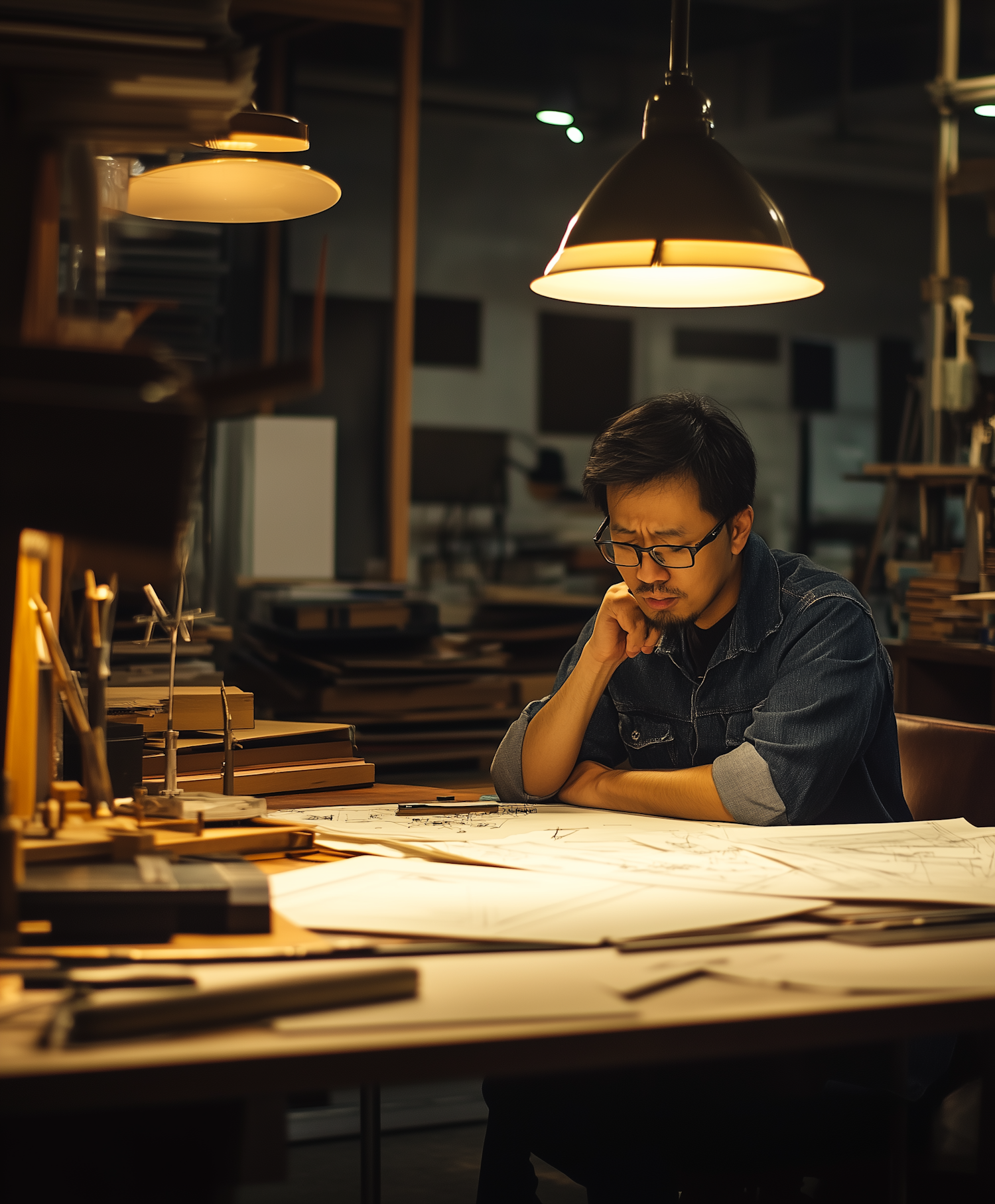 Architect in a dimly lit studio, focused on blueprints under a warm lamp. Creative workspace filled with design materials.