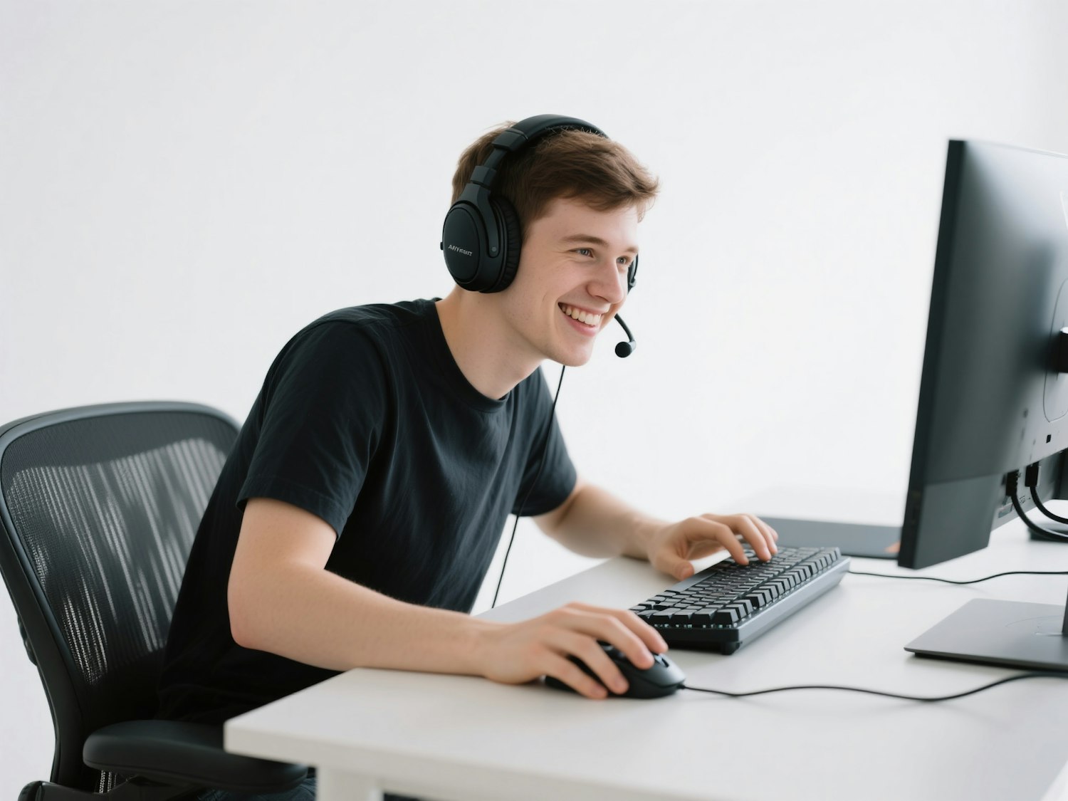 a gamer male, white solid background, gaming at his gaming pc, seen from above a little bit, front view, the monitor is not visible, he has gaming black headphones with no cable. he is smiling. clean setup