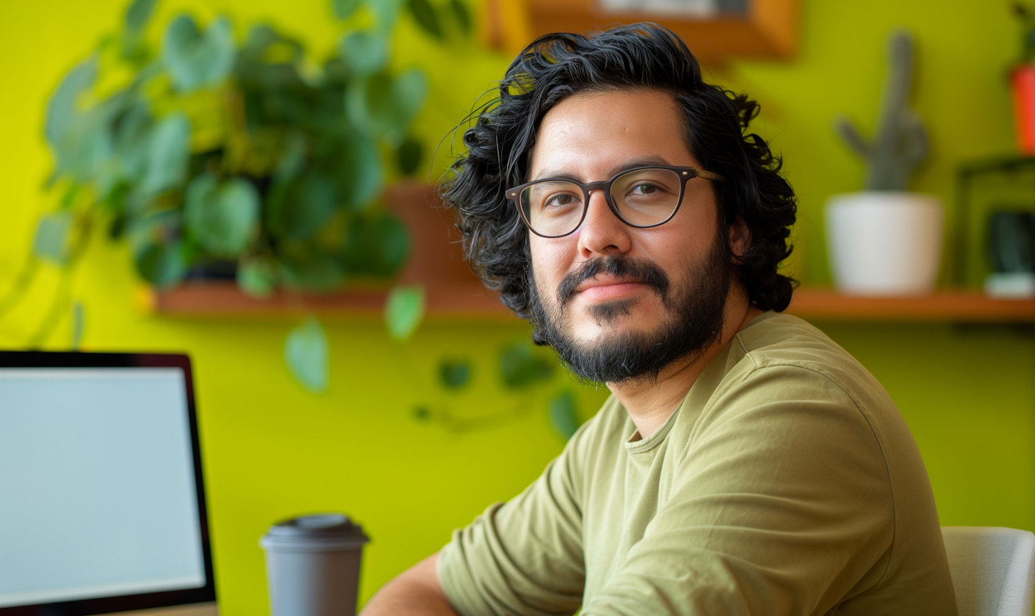 Man with glasses and beard in a green shirt, sitting at a desk with a laptop and coffee, against a vibrant green background with plants.