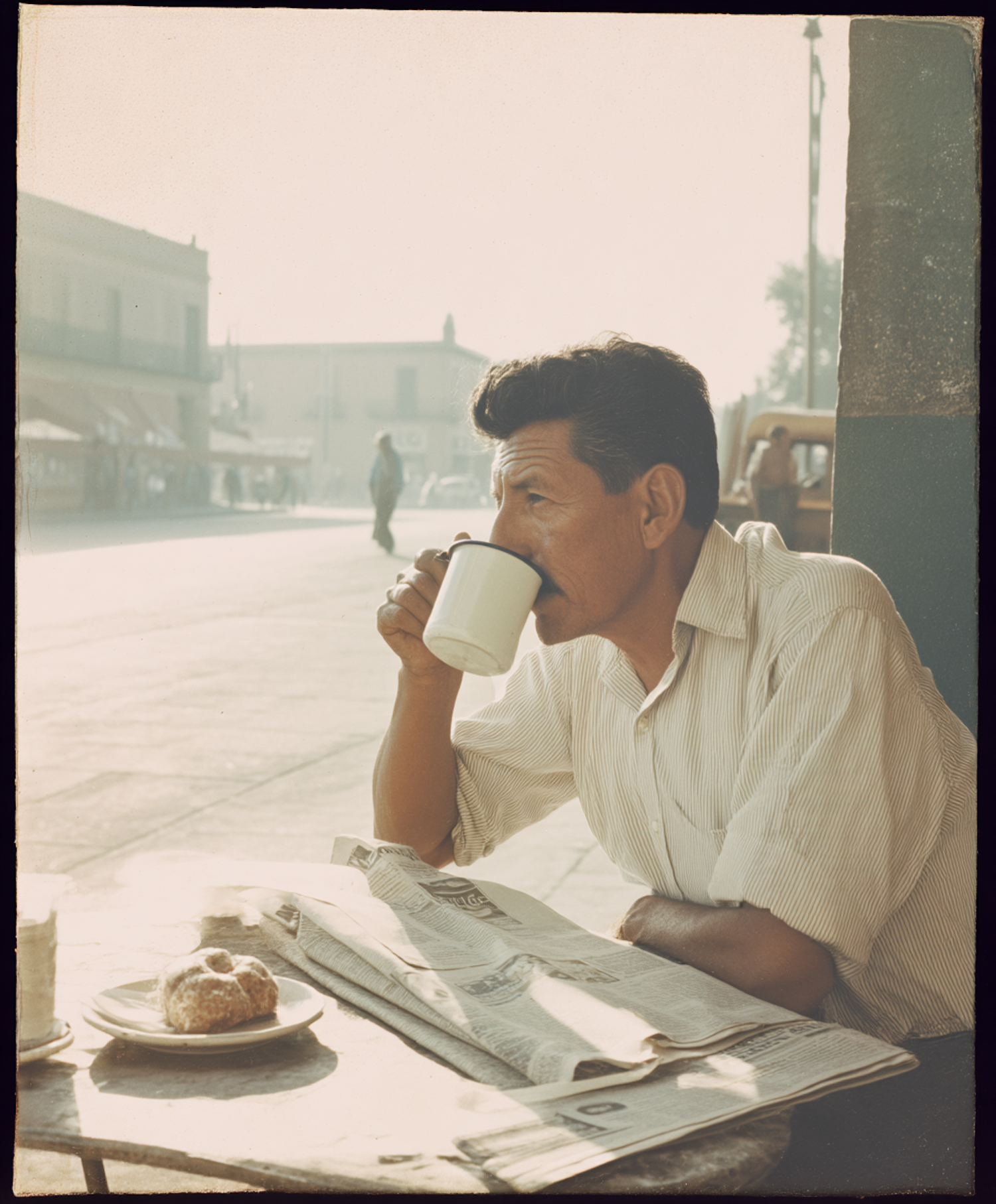 Man enjoying coffee at an outdoor café table with a newspaper and pastry, set against a hazy, golden-lit urban backdrop.