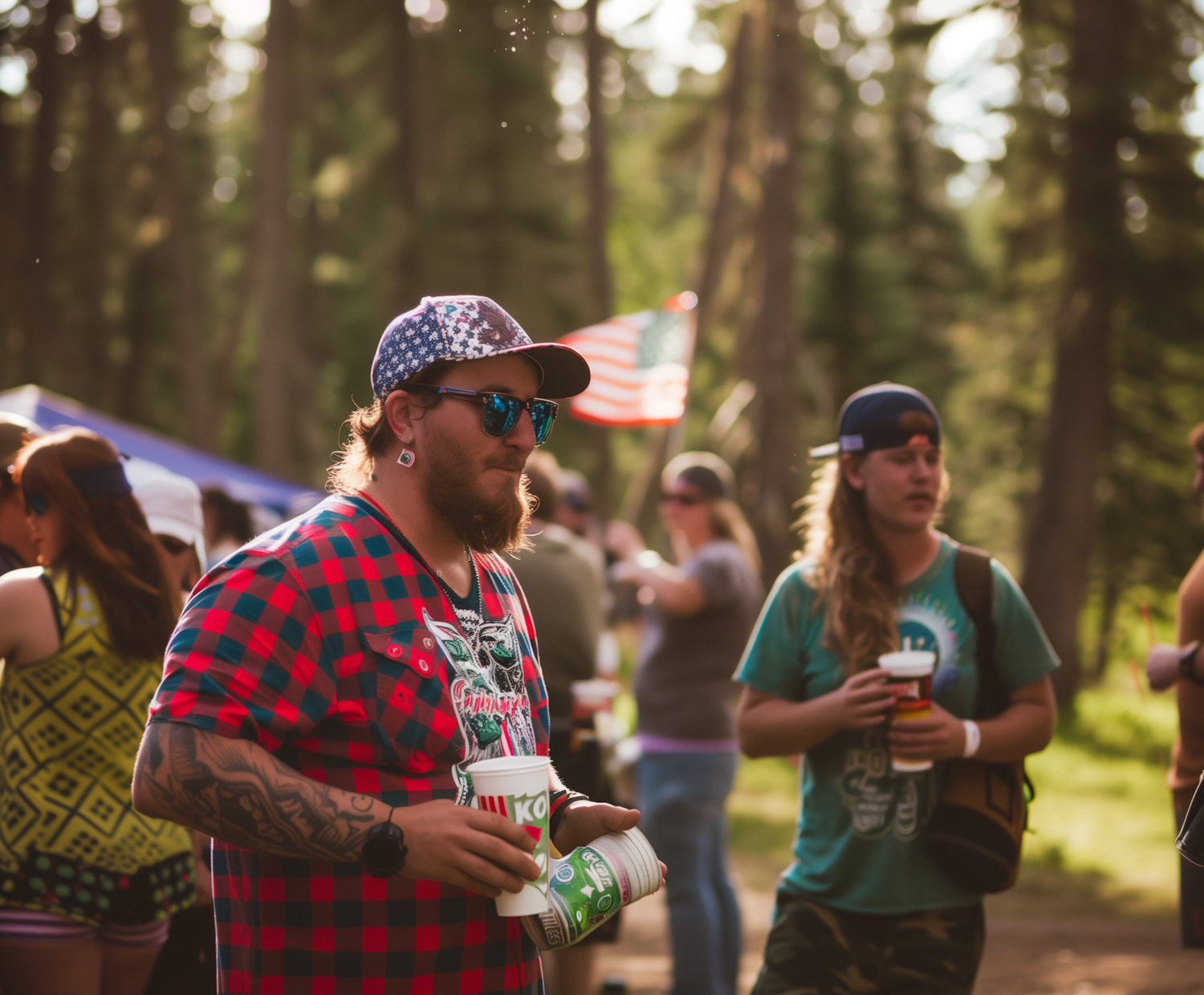 Outdoor gathering with people in casual attire, holding drinks, and an American flag in the background, set in a forest.