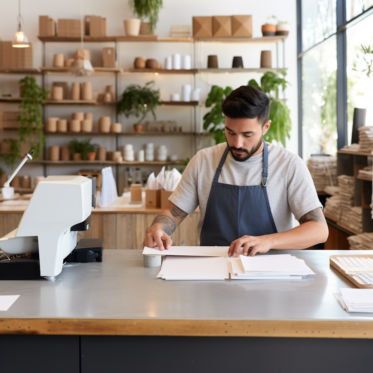 Man organizing papers in a modern store with wooden shelves and plants, wearing a gray t-shirt and apron, focused and stylish.