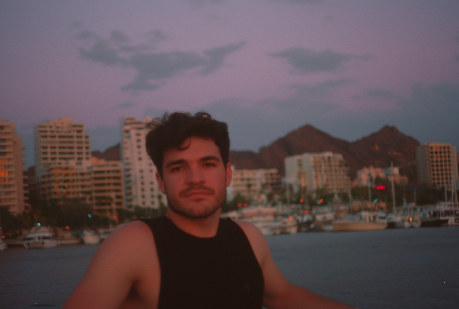 A young man in a black sleeveless shirt at a marina during twilight, with boats, buildings, and mountains in the background.