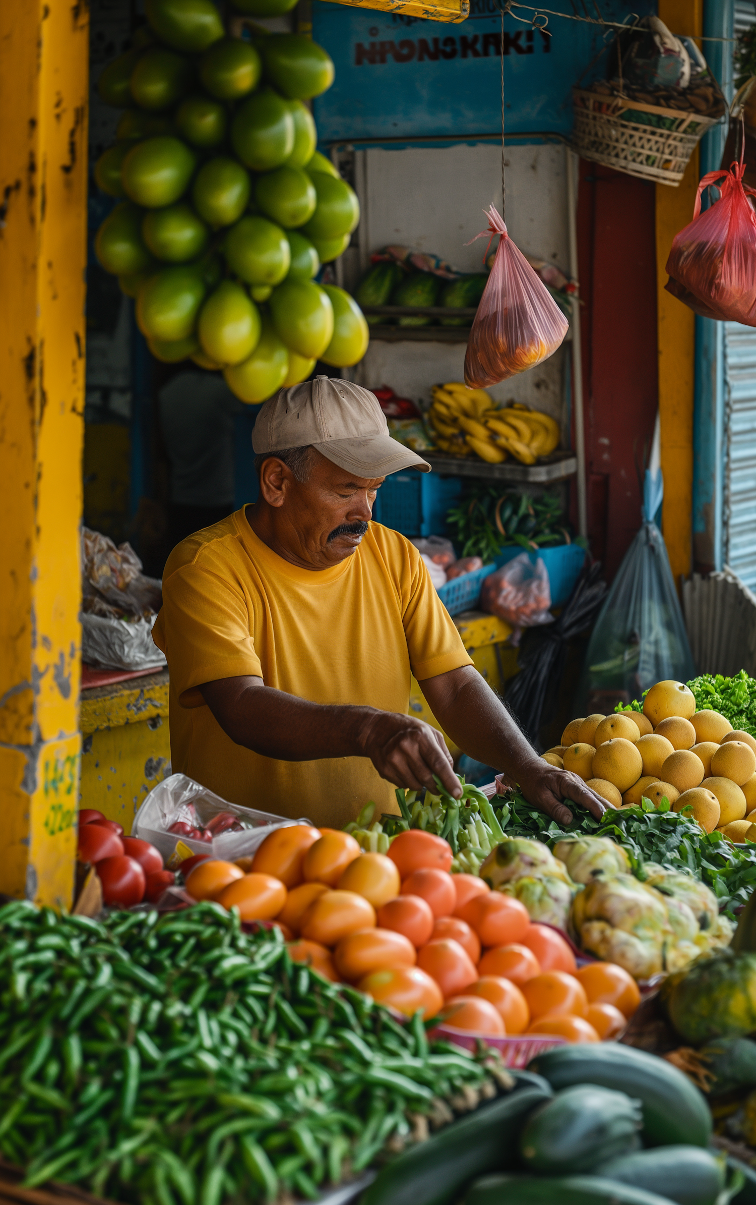 A vendor in a yellow shirt arranges fresh produce at a colorful market stall, surrounded by vibrant fruits and vegetables.