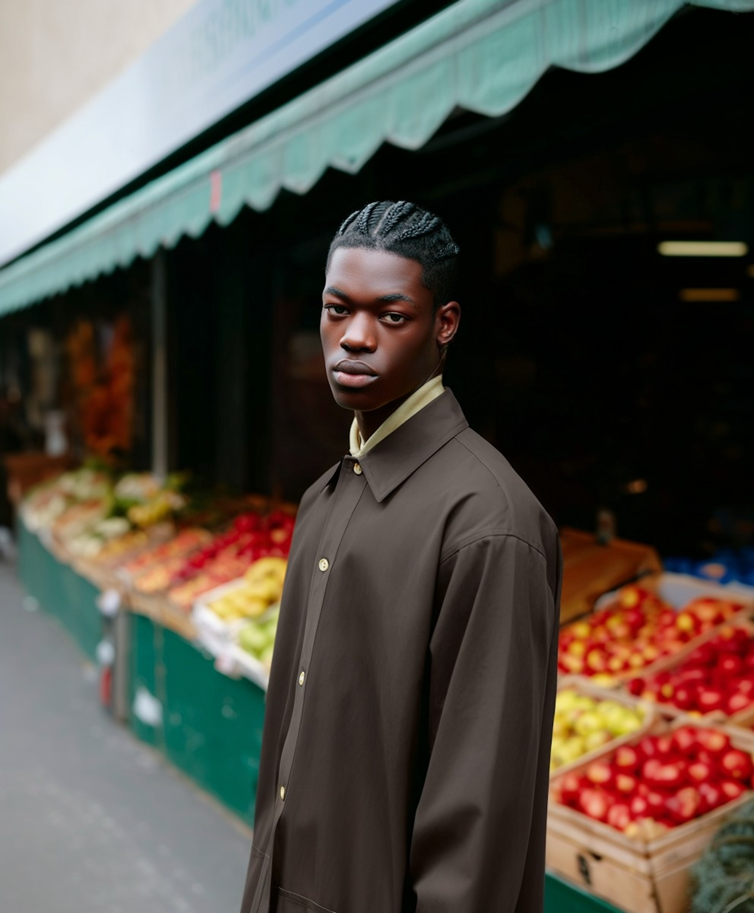 Young man in brown coat stands against colorful fruit displays of a market, vibrant contrast of his attire with the surrounding produce.