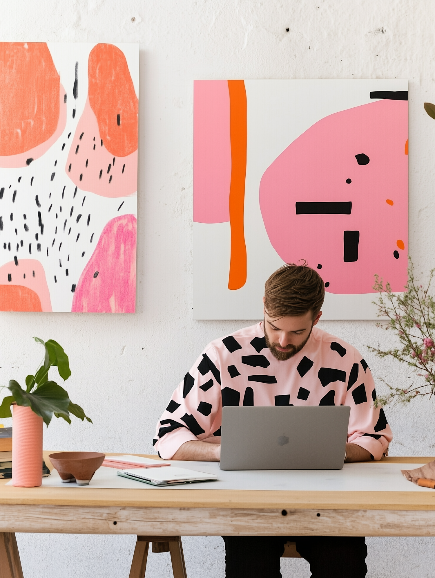Man in a pink patterned shirt working on a laptop in a modern, artistic workspace with abstract paintings and a plant.