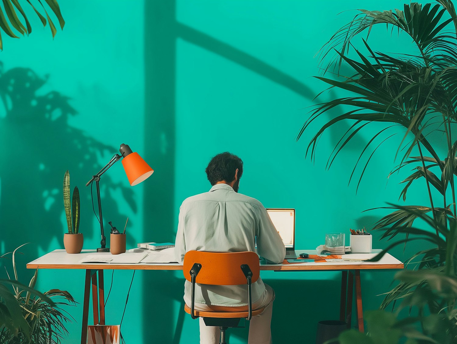 Man working at a desk with a laptop, surrounded by plants and vibrant teal walls, creating a serene workspace.