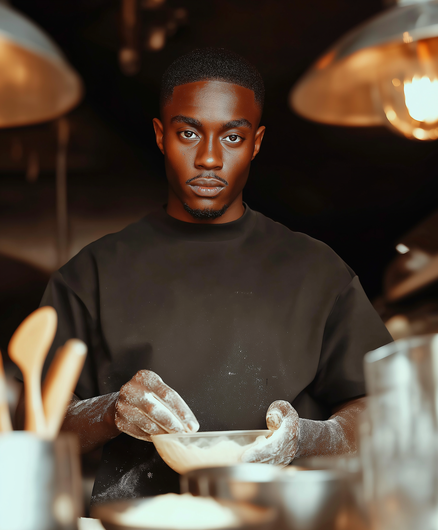 Young man focused on culinary craft, mixing ingredients in a cozy, warmly lit kitchen setup.
