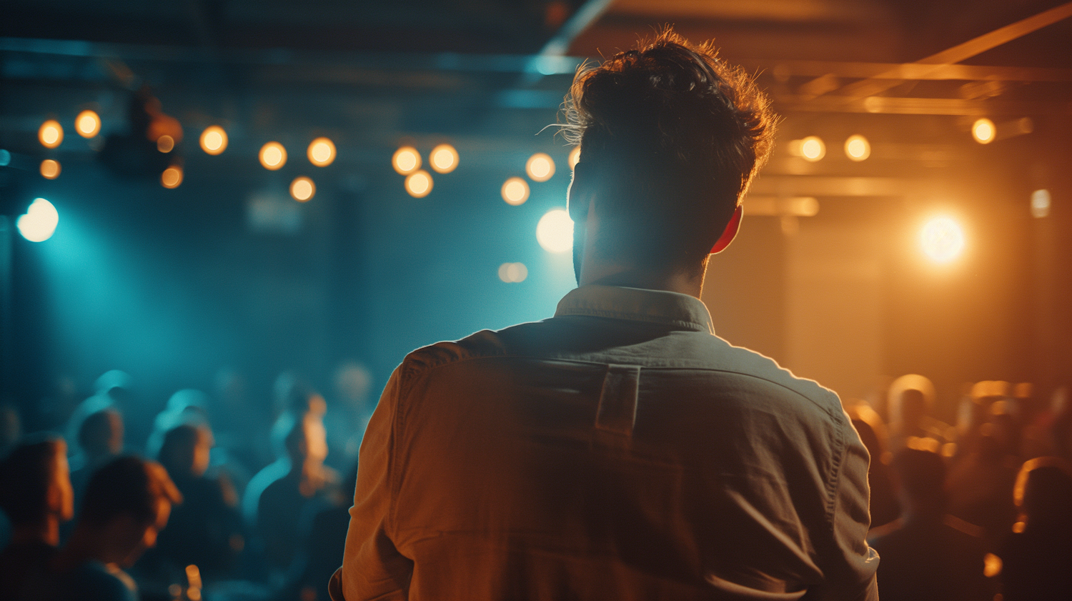 Man on stage with warm lighting, facing a blurred audience, creating an intimate and engaging atmosphere.