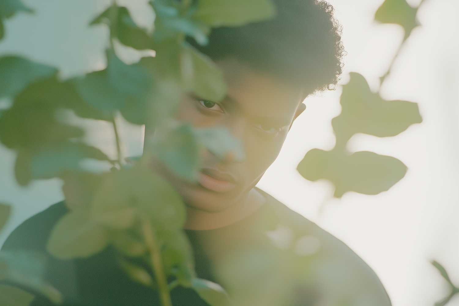 A young man with curly hair peers through soft-focus green leaves, creating a mysterious and serene vibe in warm, diffused light.