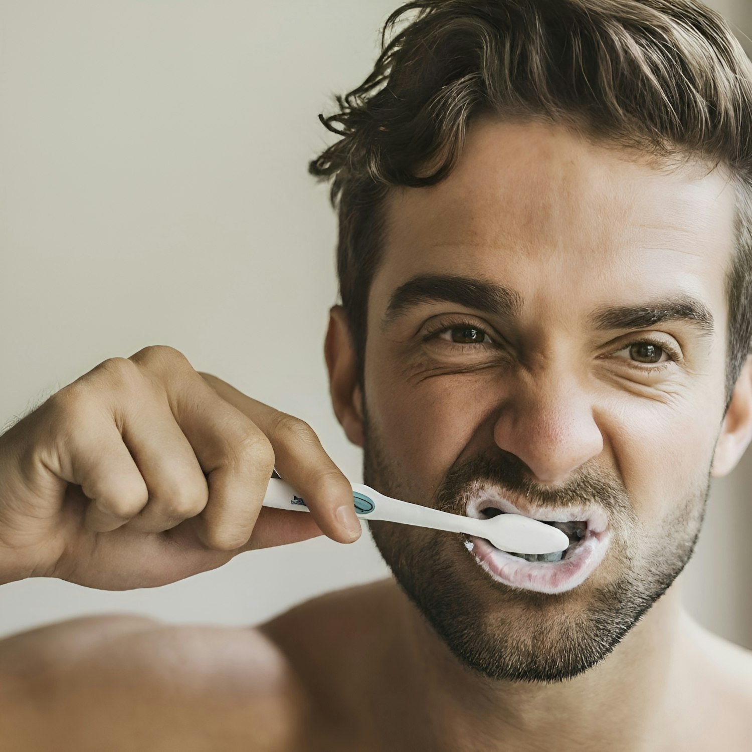 Caucasian man with brown hair brushing teeth, focused expression, white toothbrush with blue accents, toothpaste foam visible.