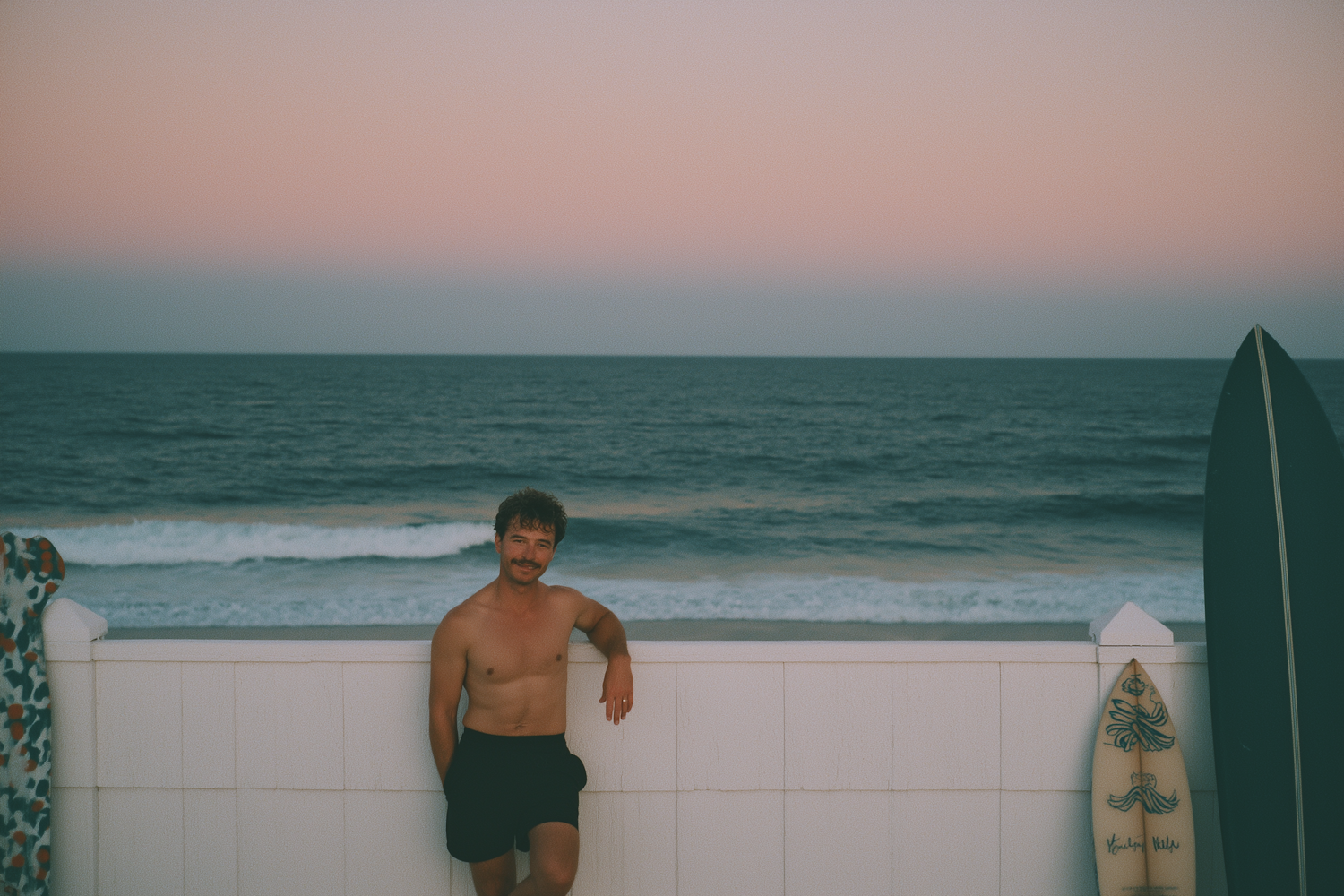 Man leaning on a white fence at the beach during sunset, with surfboards and a colorful towel nearby. Relaxed seaside vibes.