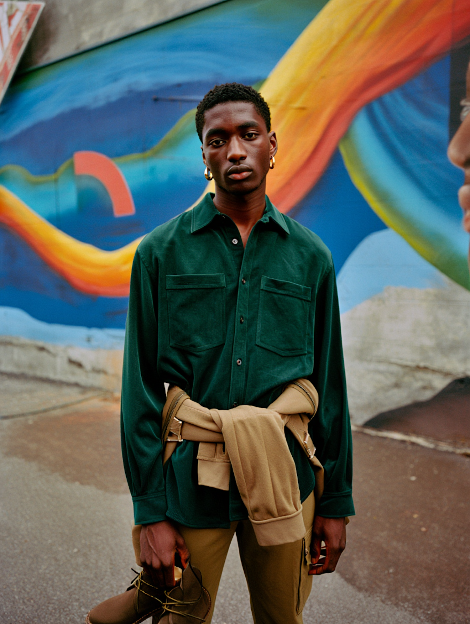 Stylish young man in green shirt and khakis poses against a vibrant mural backdrop, holding brown boots in an urban setting.