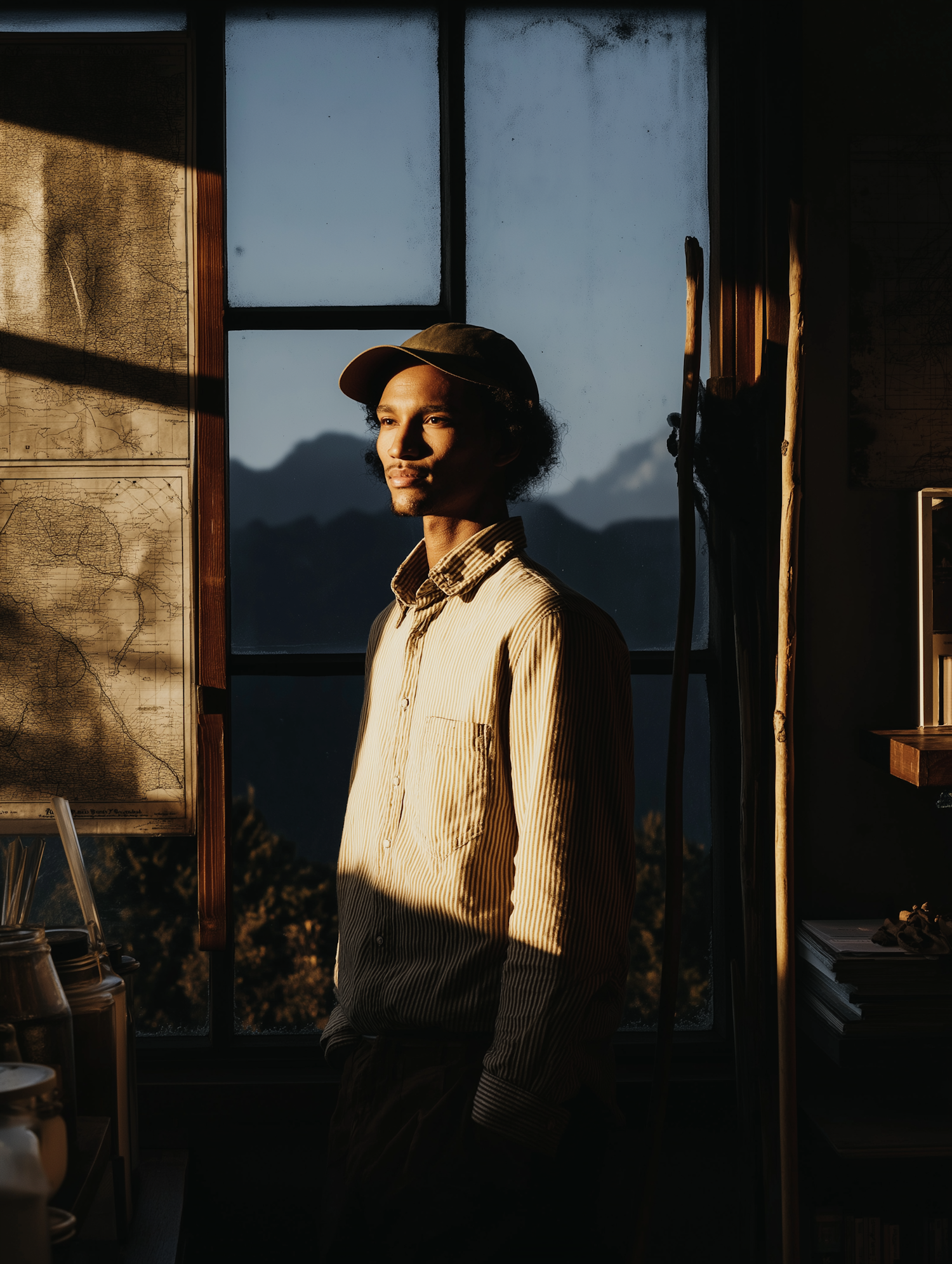 A man in a striped shirt and cap stands by a window, bathed in golden light, with a serene mountain view in the background.