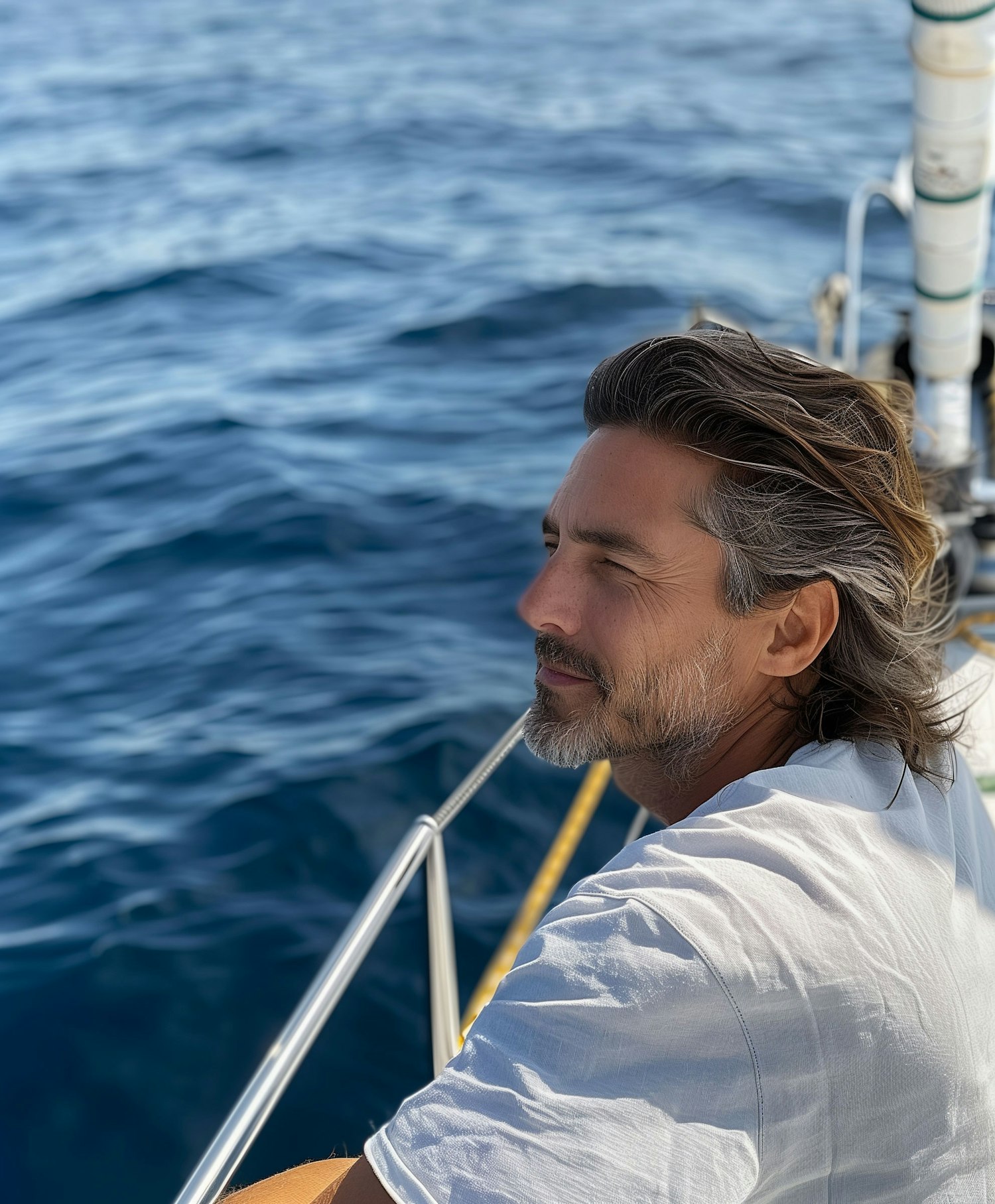 Caucasian man with wavy hair and beard enjoys a serene boat ride, gazing at the ocean under the sun.