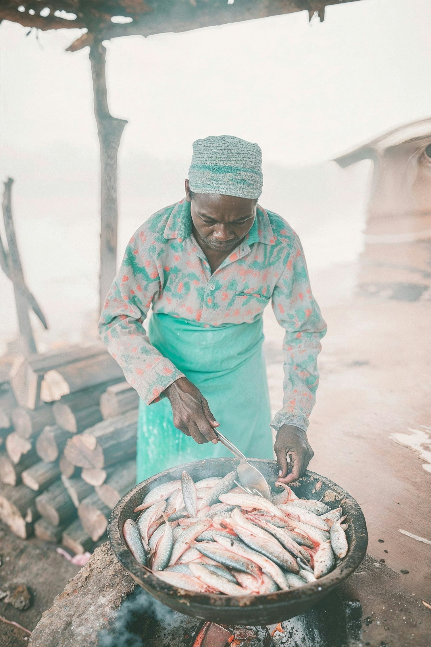 Man cooking fish outdoors in a rustic setting, wearing a green apron and cap, with logs in the background. Misty atmosphere adds serenity.