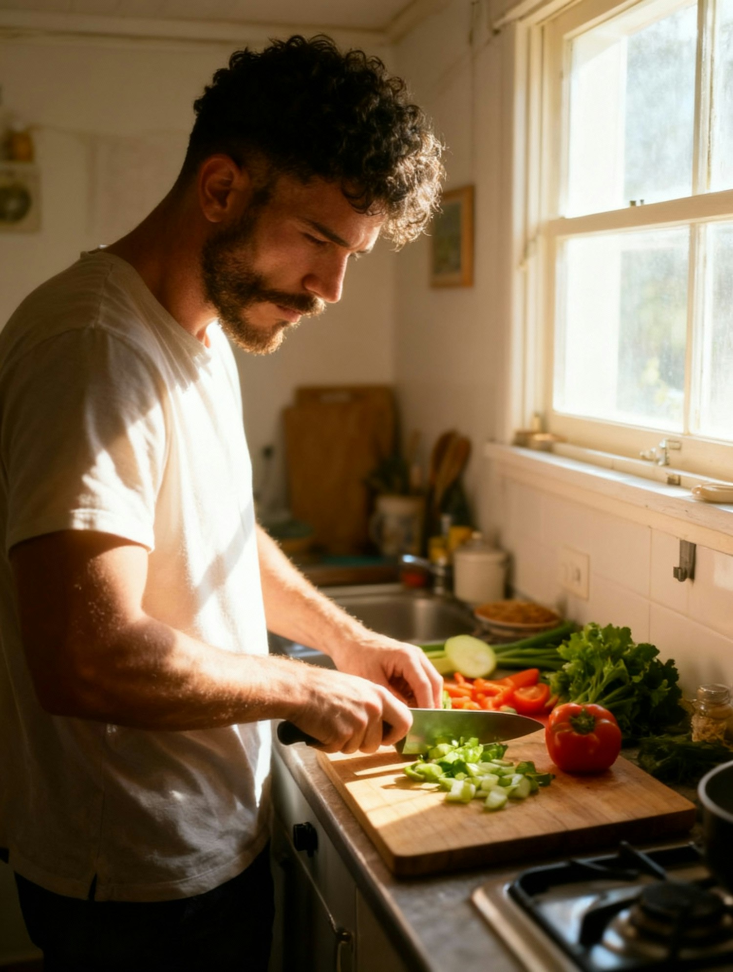 A man slicing vegetables in a sunlit kitchen, surrounded by fresh produce, creating a warm and inviting cooking scene.