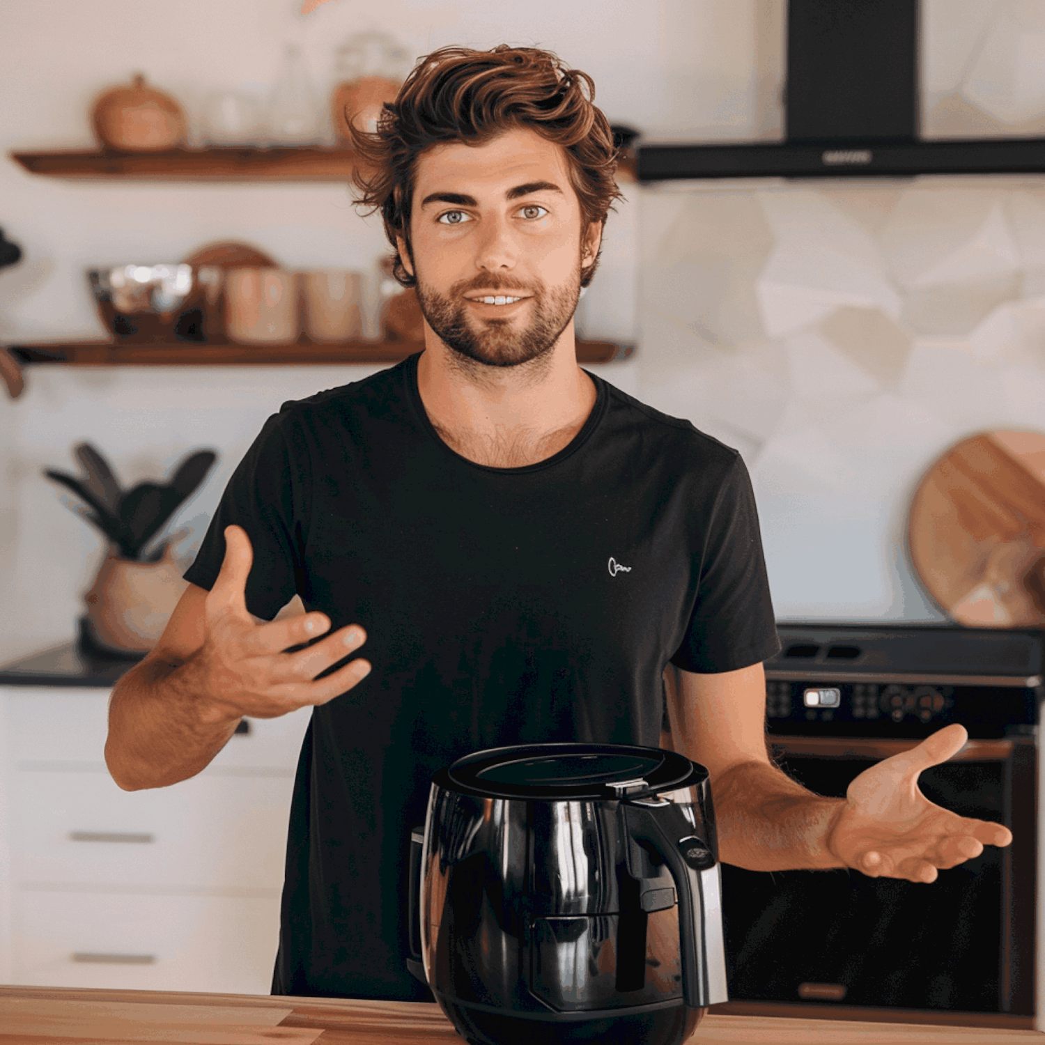 Caucasian man with brown hair and beard in a kitchen, gesturing near a black air fryer on a wooden countertop.