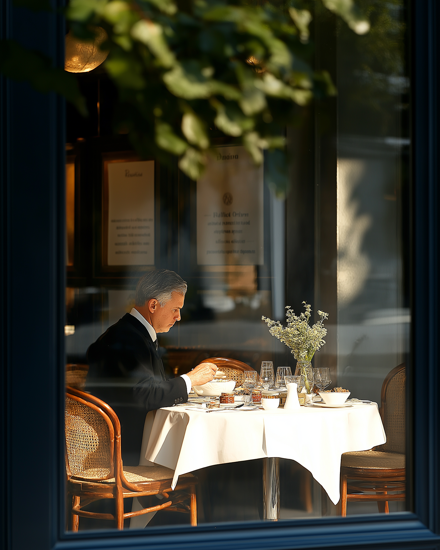 Elegant dining scene with a man in a suit enjoying a meal at a restaurant, viewed through a window with greenery.