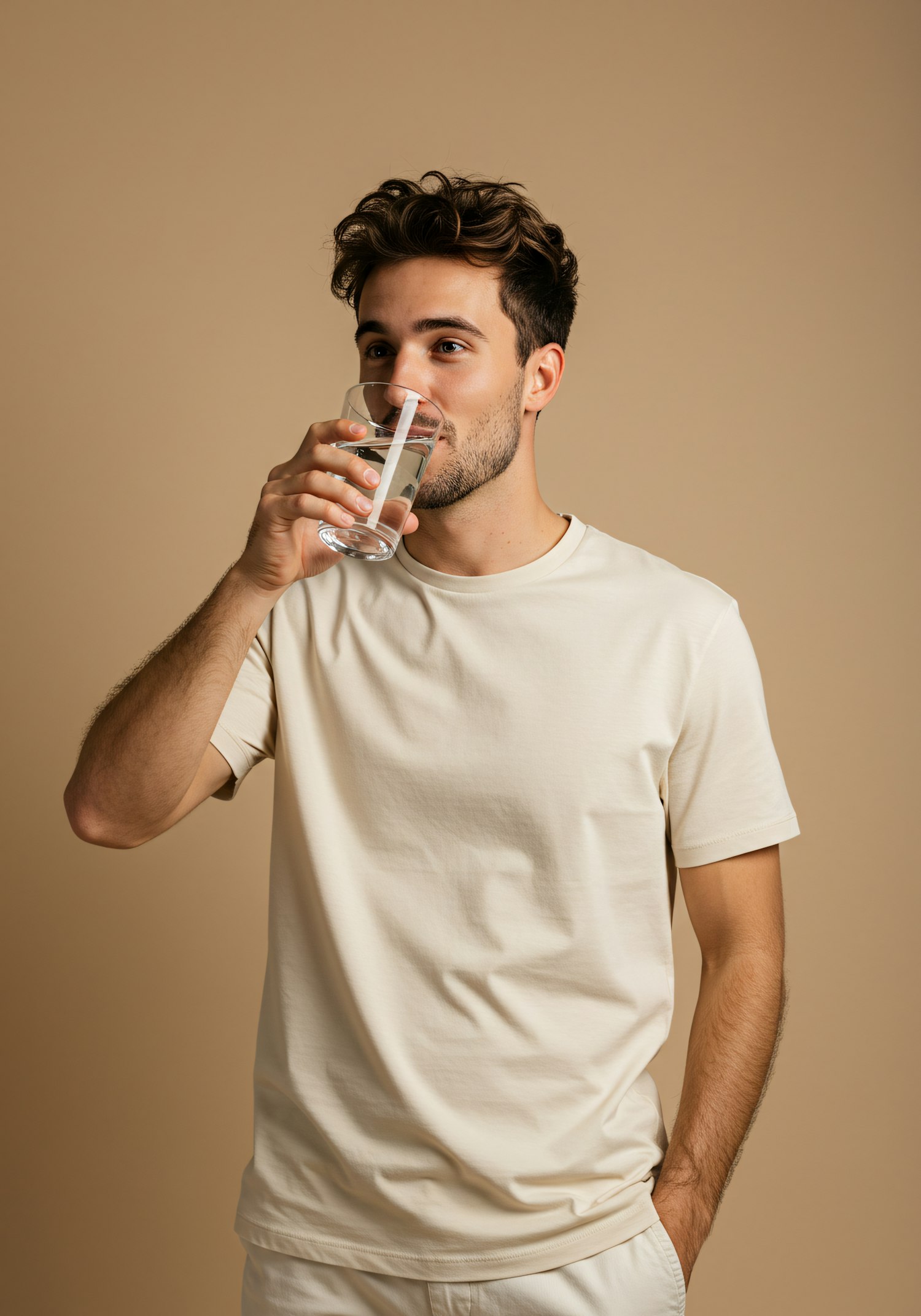 A young man in a beige shirt drinks water from a glass, standing against a plain beige background with a relaxed expression.