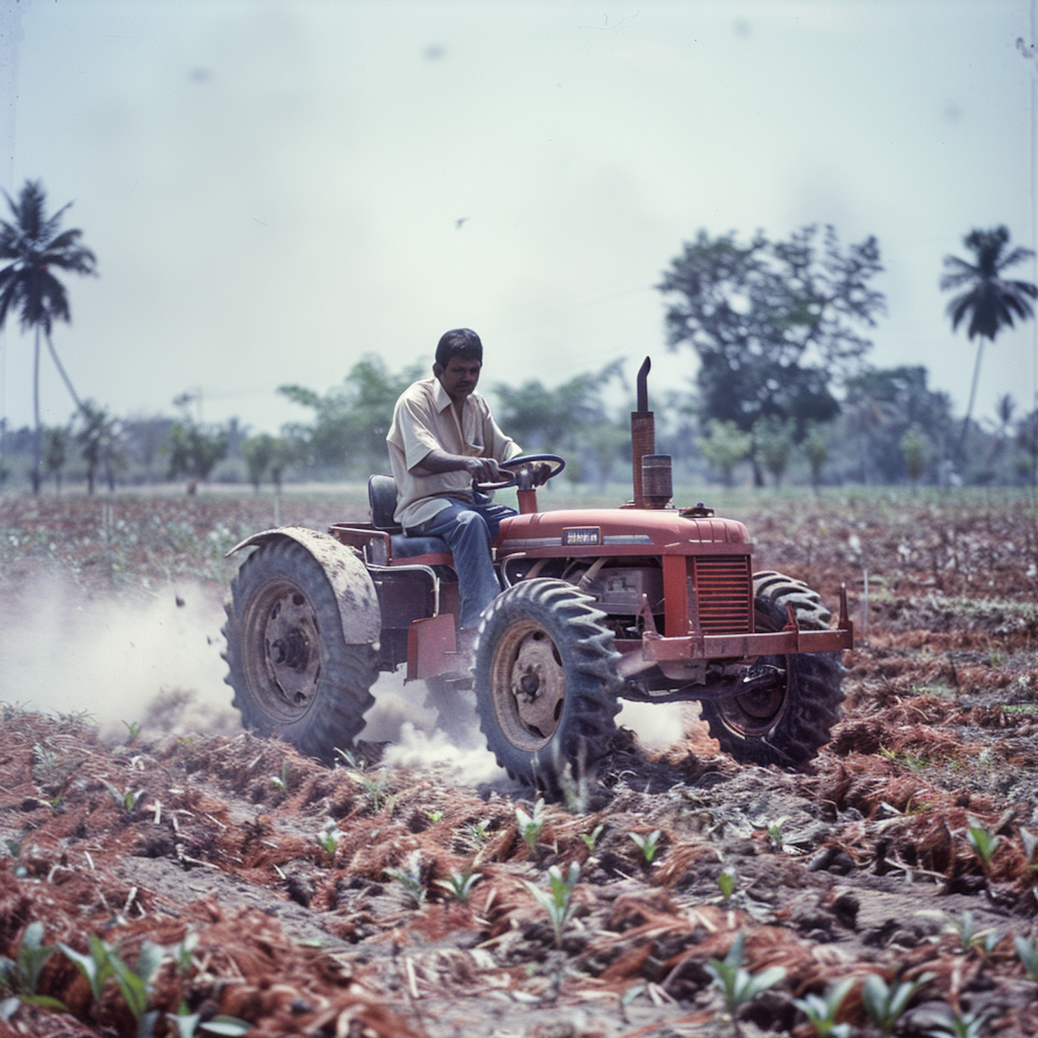 A farmer drives a red tractor through a dusty field with young plants, surrounded by palm trees under a bright sky.