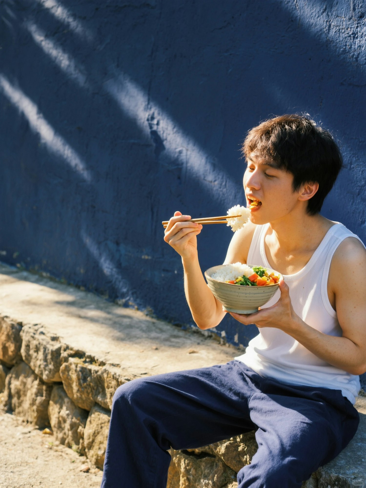 A young man enjoys a meal outdoors, holding a bowl of rice and vegetables, with a textured blue wall and sunlight in the background.