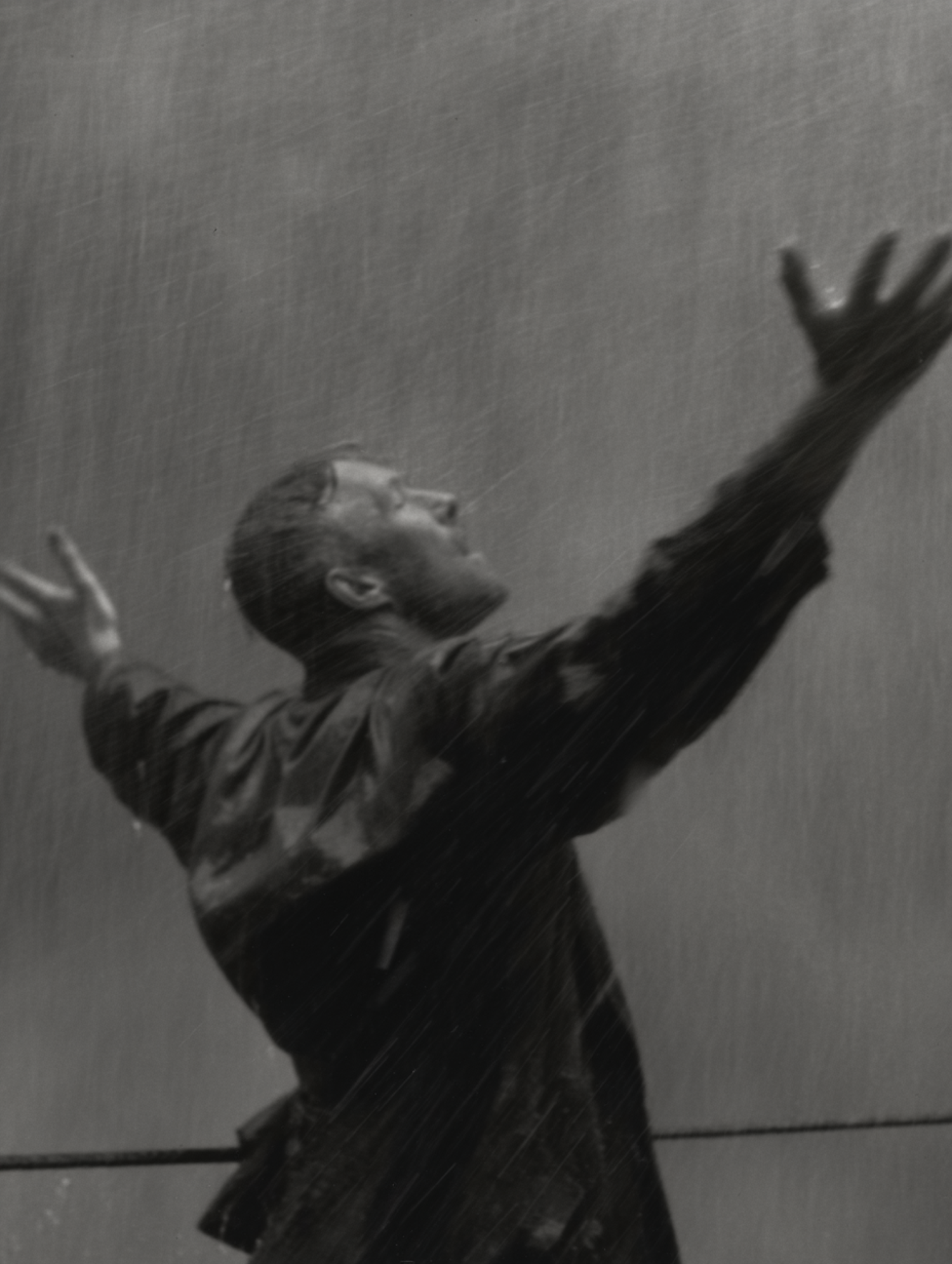 Dramatic black-and-white shot of a man in the rain, arms outstretched, head tilted back, capturing a moment of emotional release.