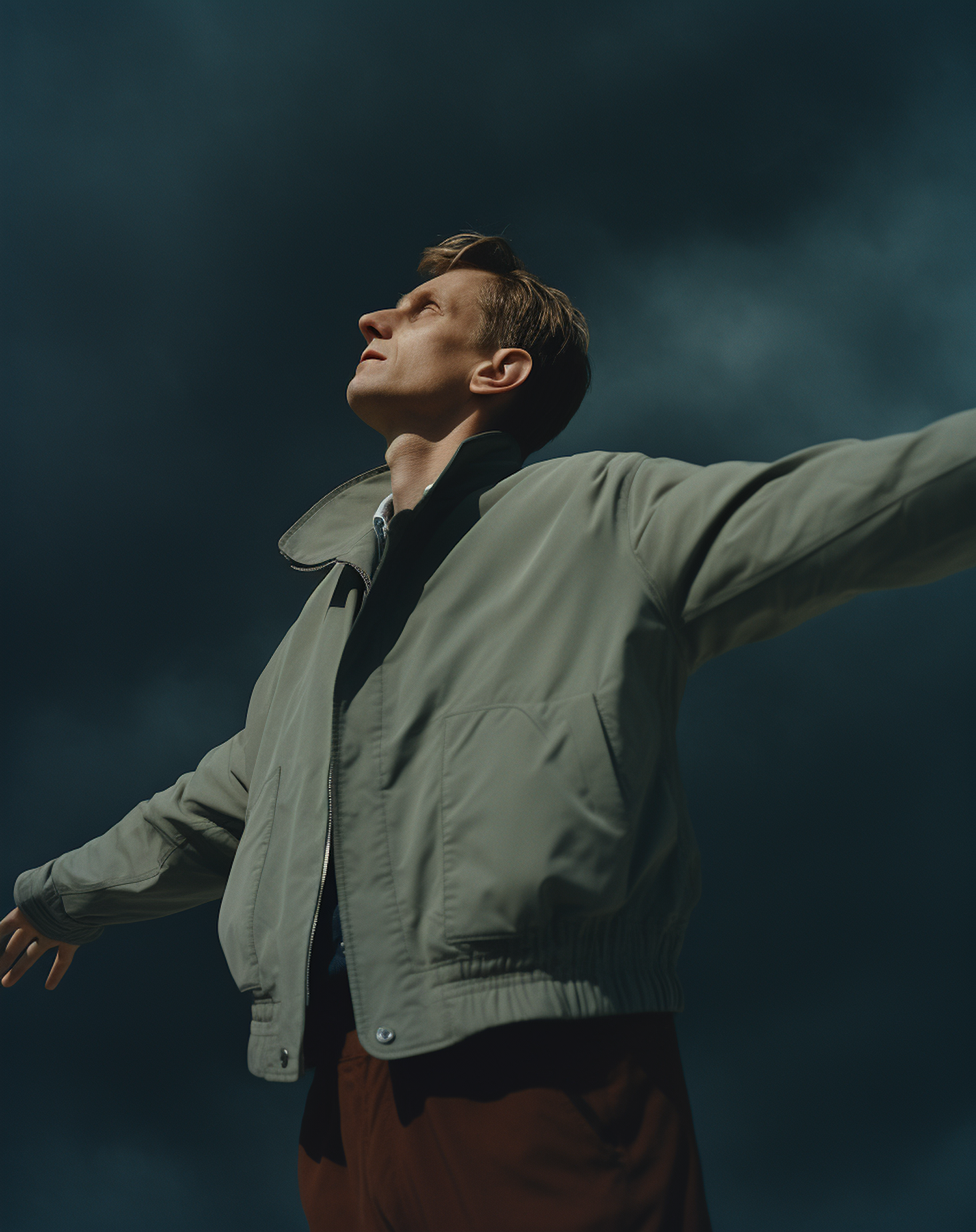 Man in light gray jacket stands with arms outstretched against a dramatic cloudy sky, conveying freedom and introspection.
