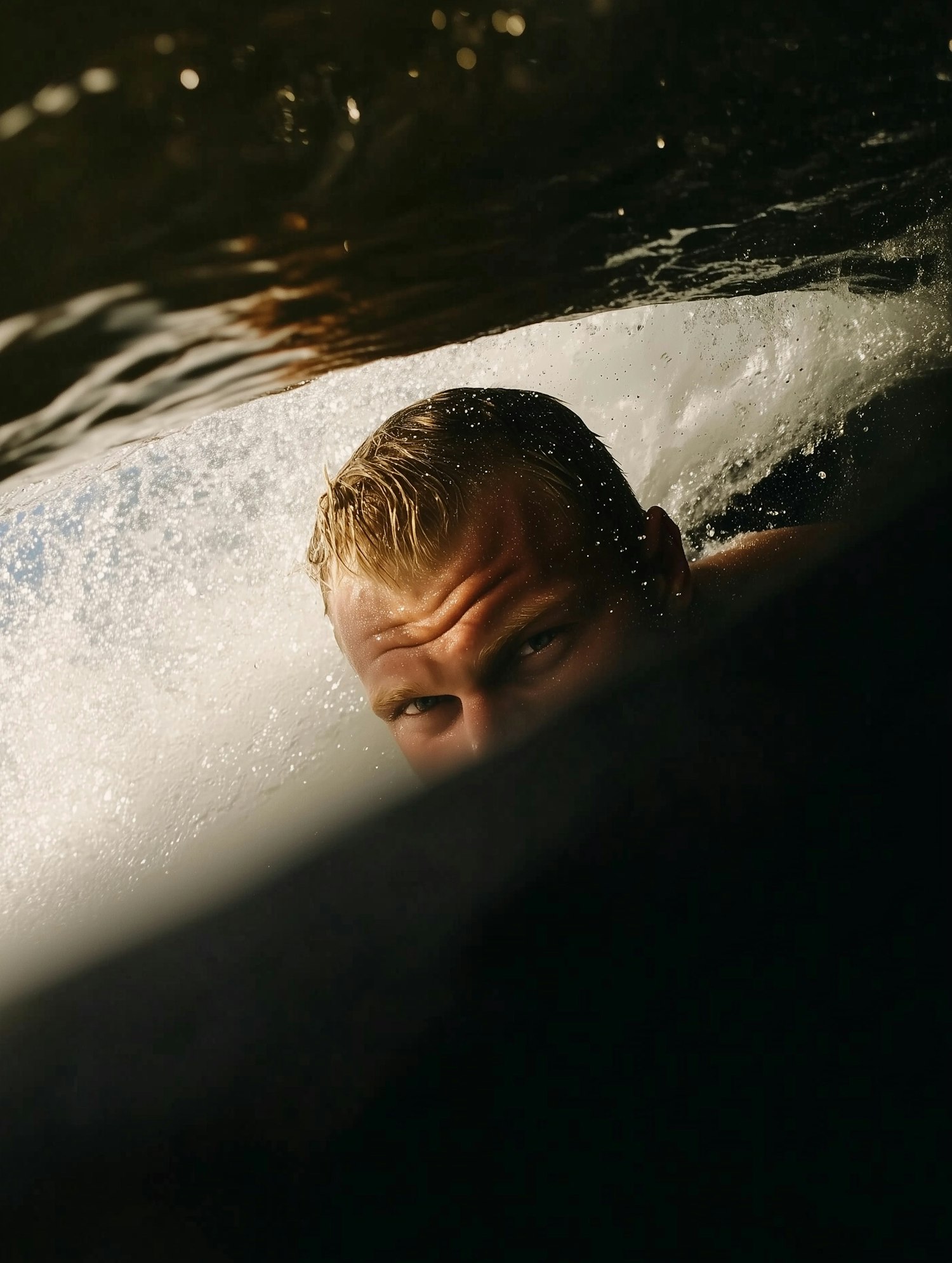 Dramatic close-up of a man with blonde hair emerging from a wave, water droplets and motion captured in stunning detail.