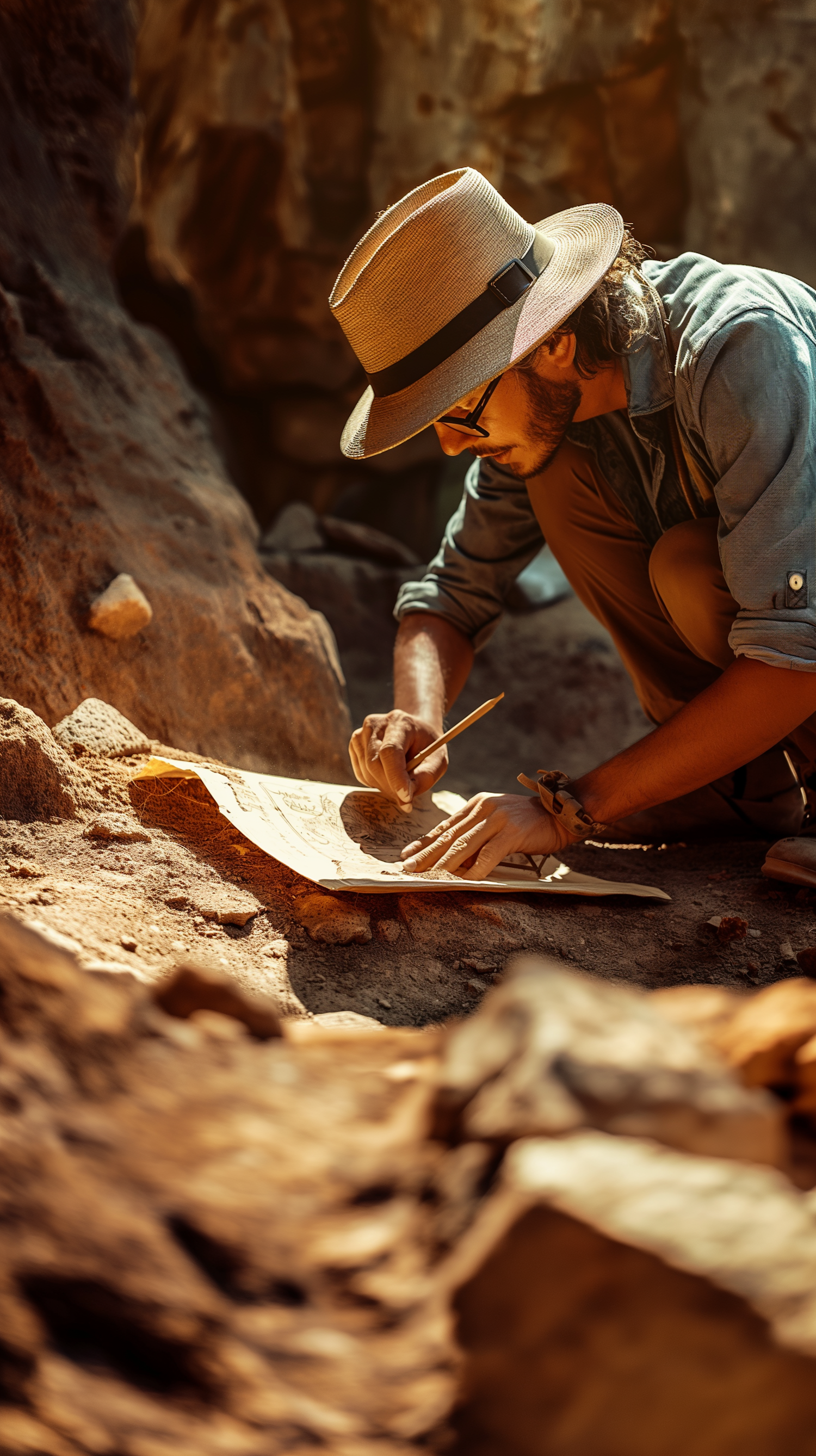 Man in a straw hat sketching on parchment in a rocky, sunlit outdoor setting, evoking exploration and discovery.
