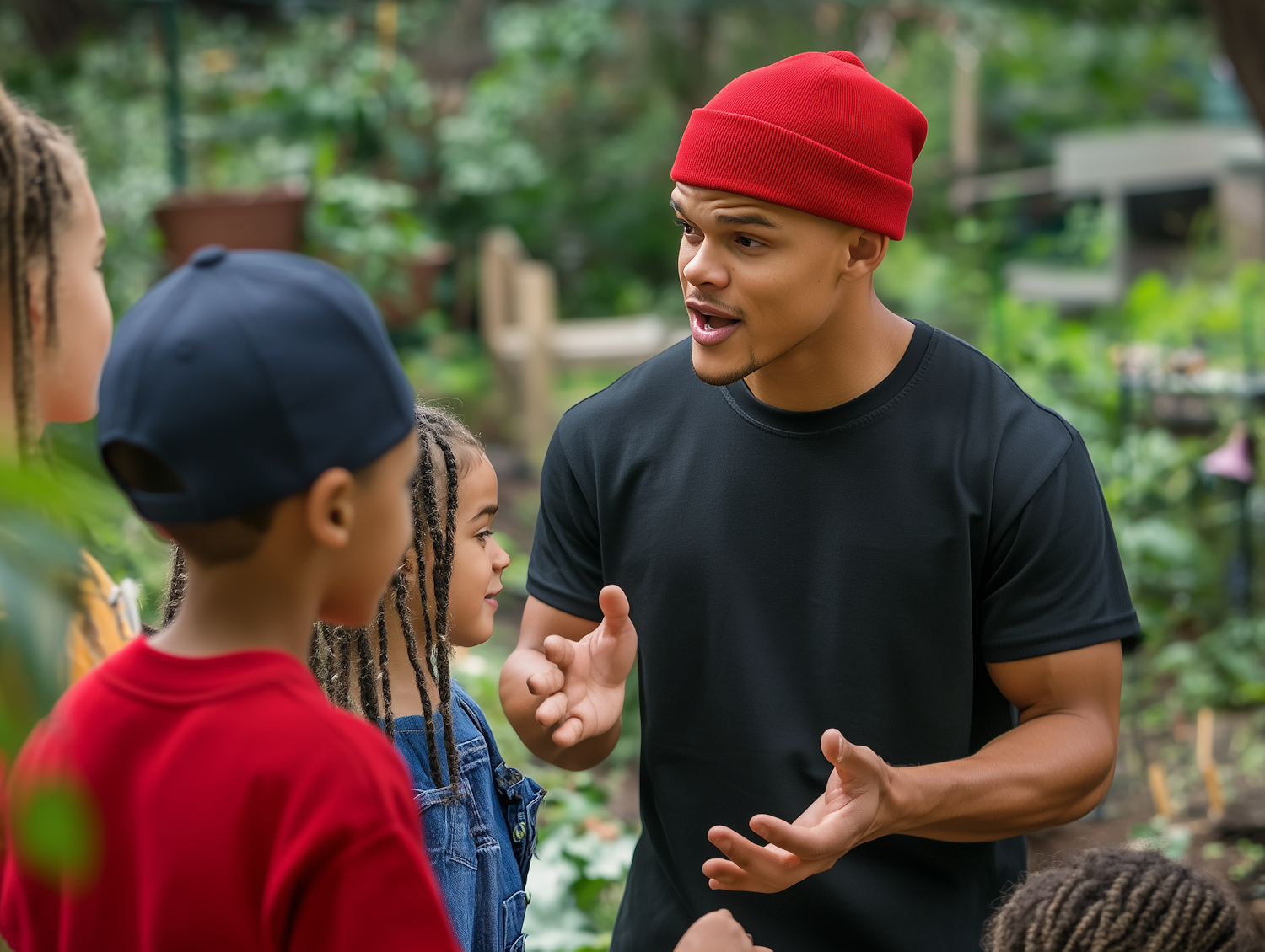 A young man in a red beanie engages children in a lively discussion in a lush outdoor garden setting.