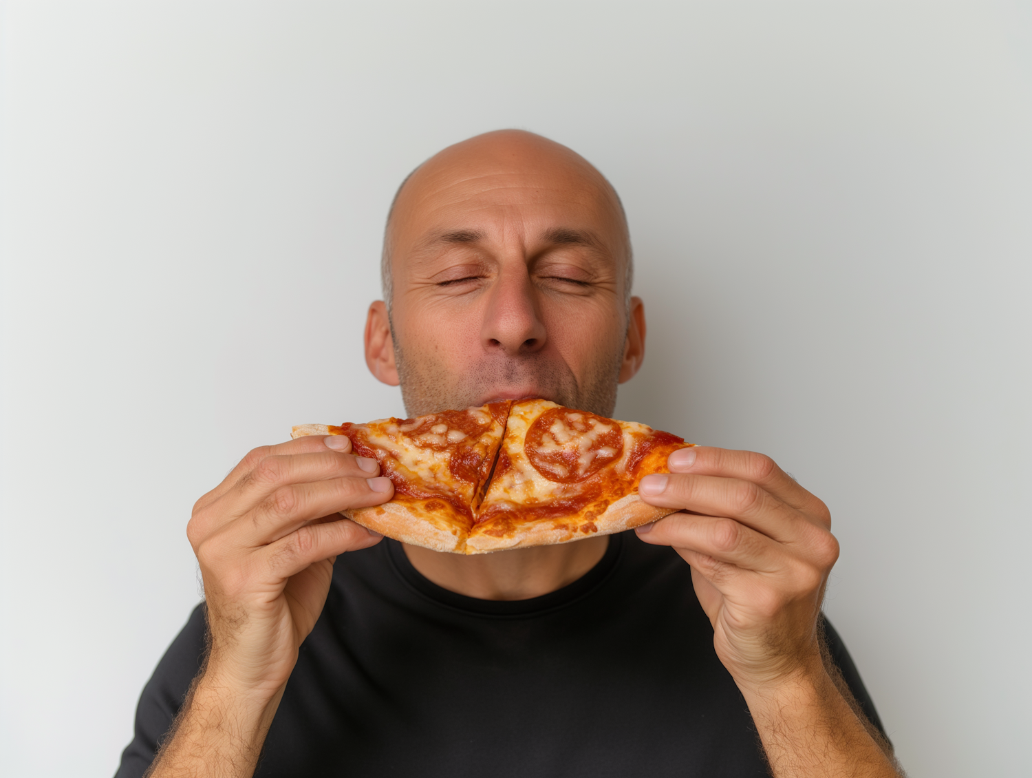 Bald man savoring a slice of pizza with eyes closed, wearing a black shirt against a plain background.
