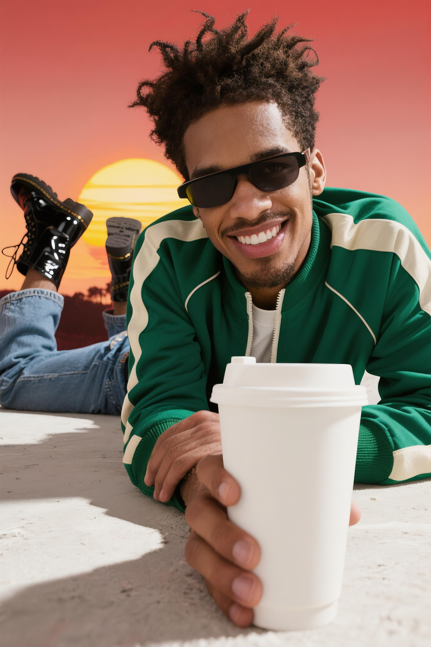 Man in green jacket and sunglasses smiling while holding a coffee cup against a vibrant sunset background.