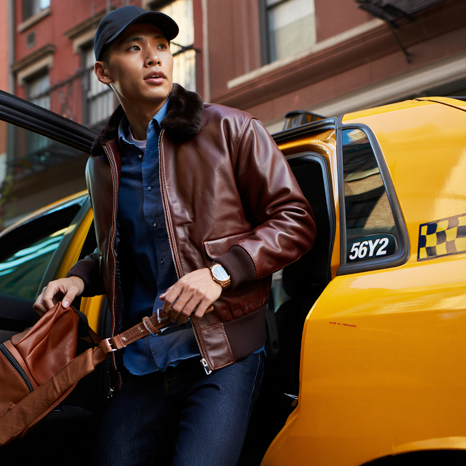 Man in a brown leather jacket stepping out of a yellow taxi, holding a leather bag, in a city street with brick buildings.