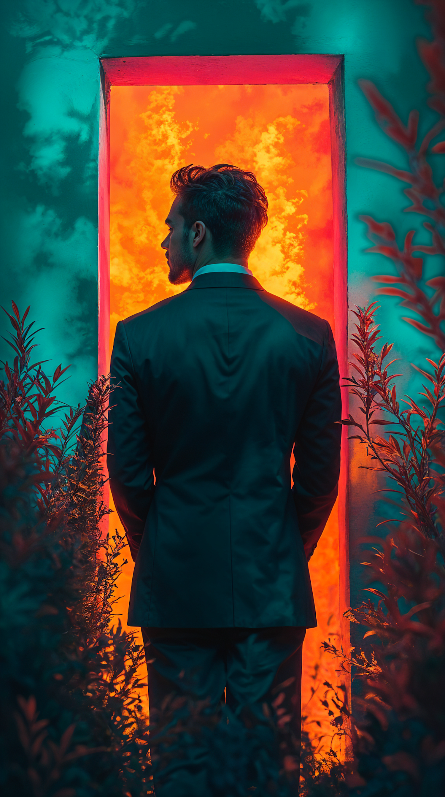 Man in a suit stands before a glowing fiery doorway, surrounded by lush foliage in a surreal, colorful scene.
