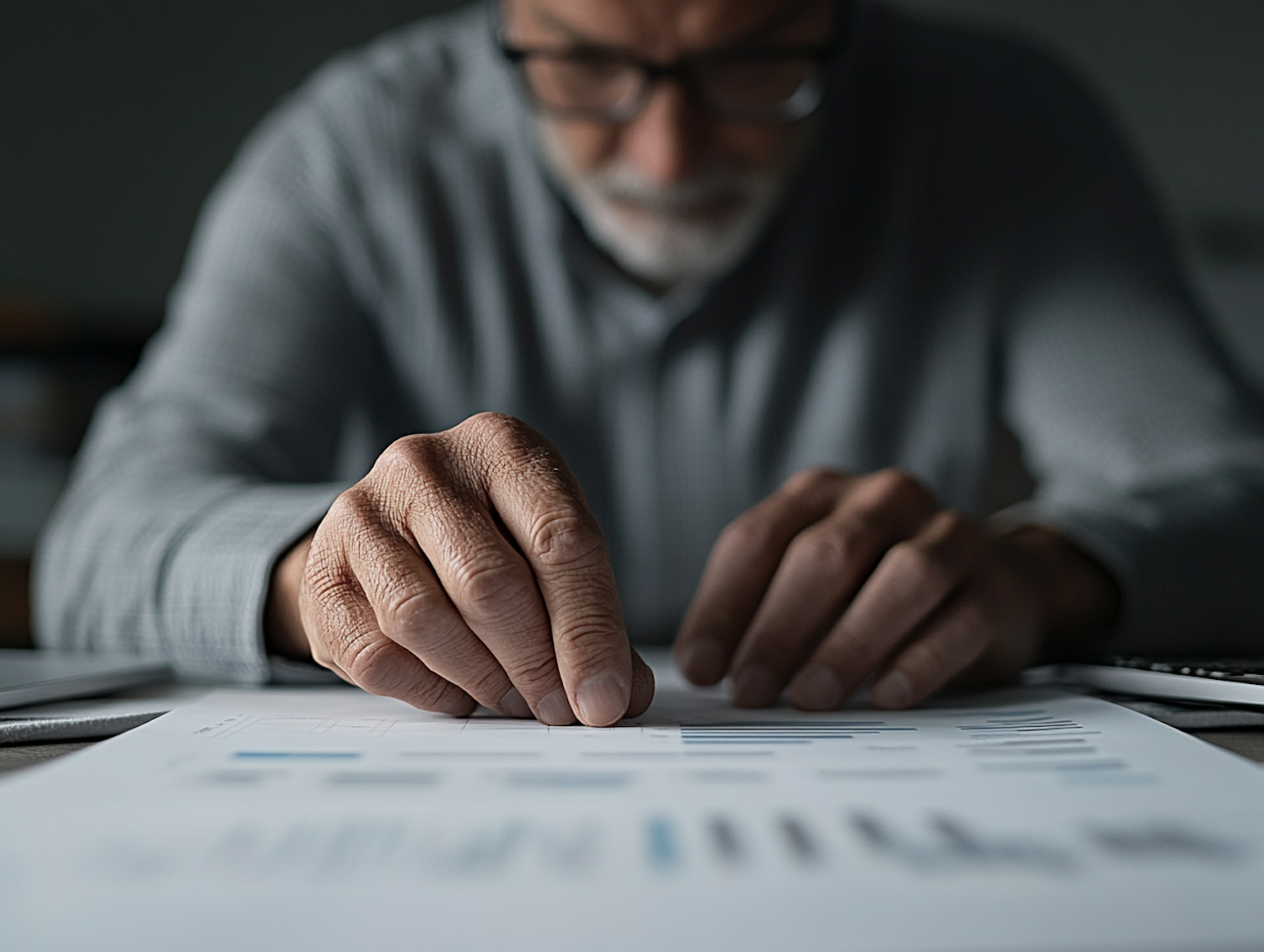 Middle-aged man analyzing documents with focus, hands prominently on paper, wearing glasses and a striped shirt in a professional setting.