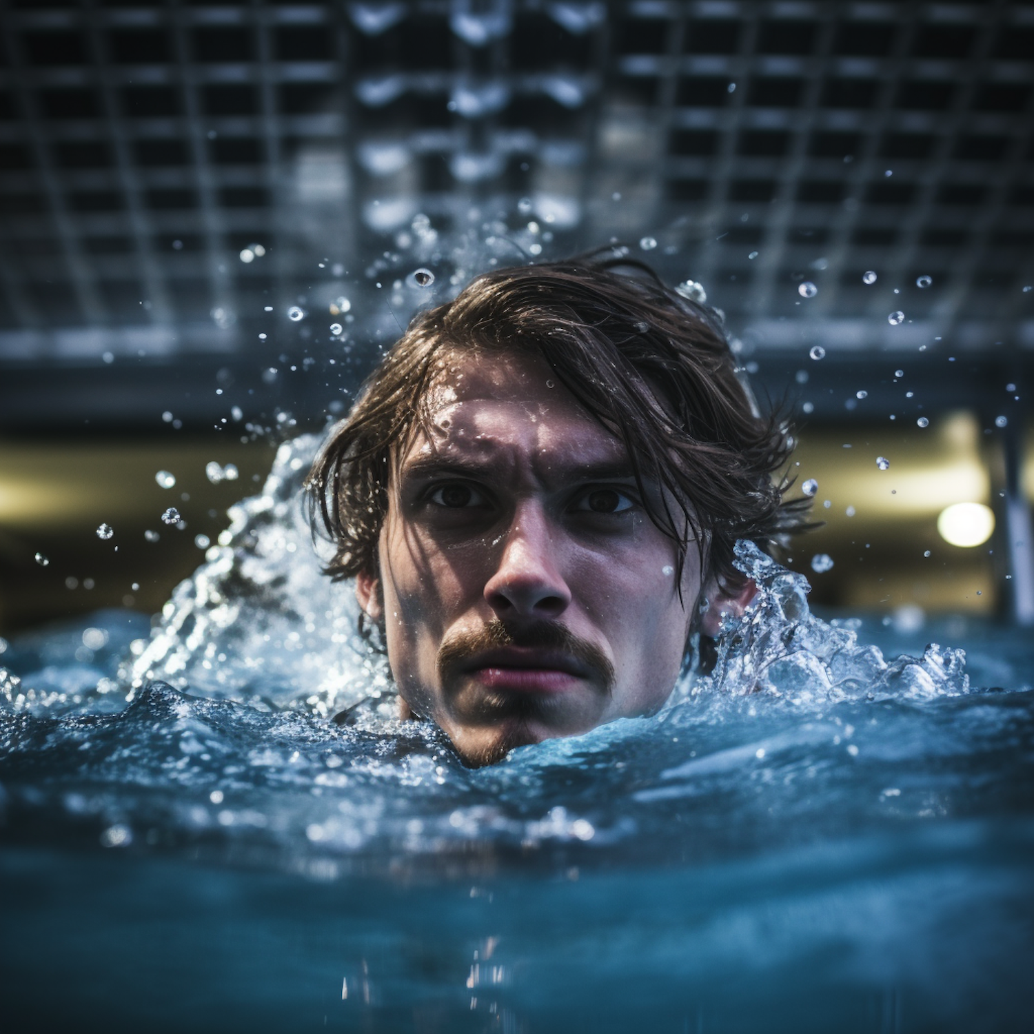 Intense moment of a man emerging from water, droplets flying, with a focused expression. Dramatic lighting and dynamic movement captured.