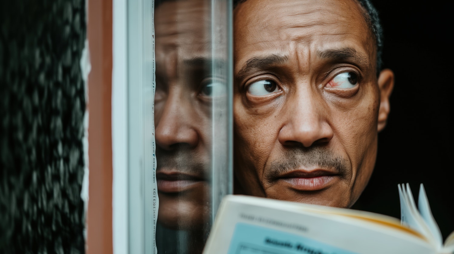 A man with a cautious expression peers out a window, holding a book. His reflection in the glass adds depth to the scene.