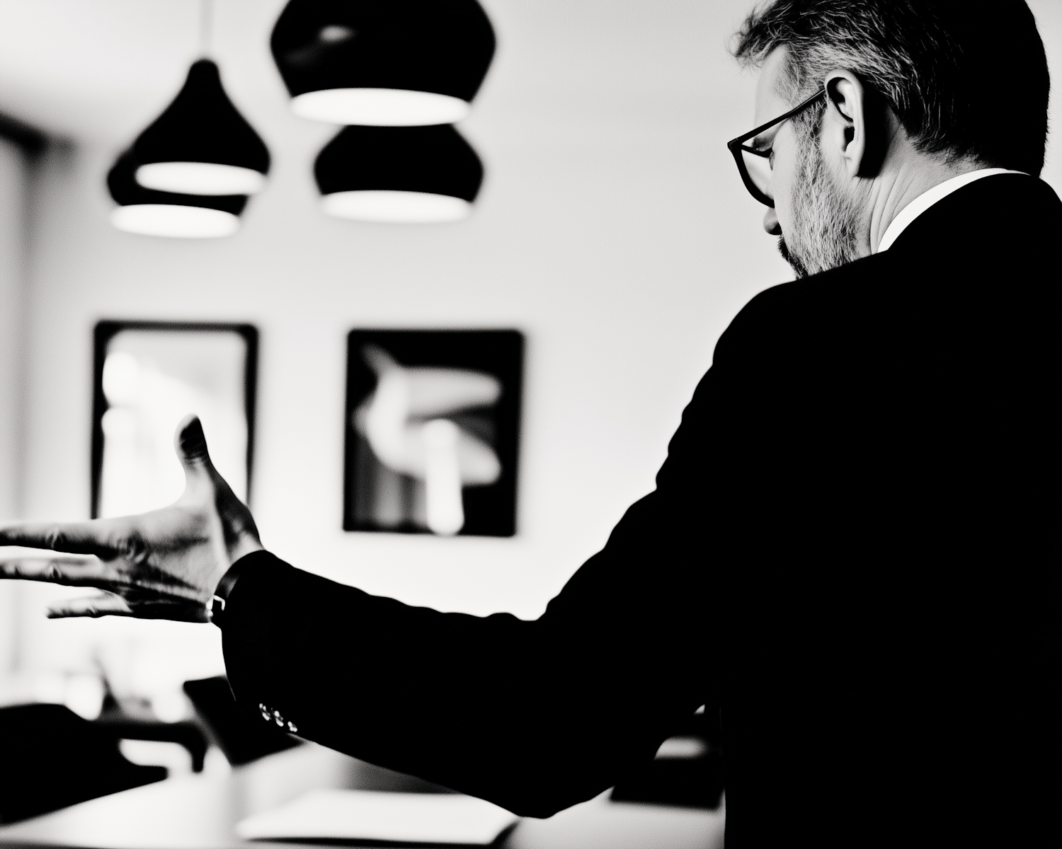 Black-and-white image of a man in a suit gesturing in a modern office with abstract art and pendant lights in the background.