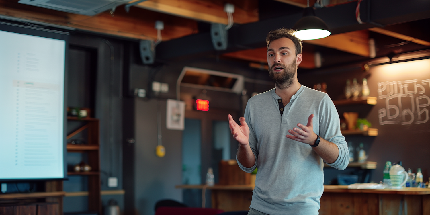 Man presenting in a modern room with a screen and chalkboard, gesturing expressively. Casual, industrial-style setting with warm lighting.